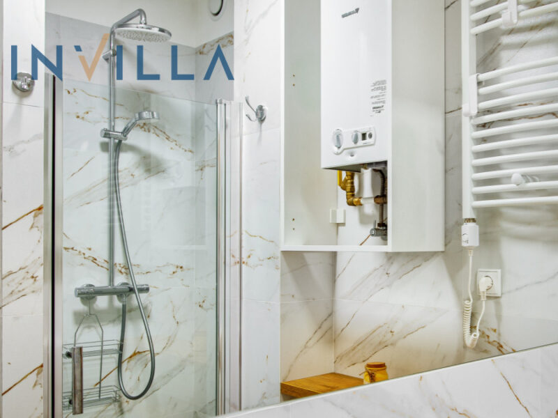 Ogrzewanie dostarczane jest z sieci miejskiej, a ciepłą wodę zapewnia piecyk gazowy.