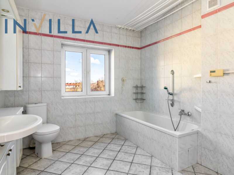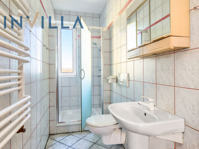 - łazienka z oknem wyposażona w kabinę prysznicową (3,3 m2),