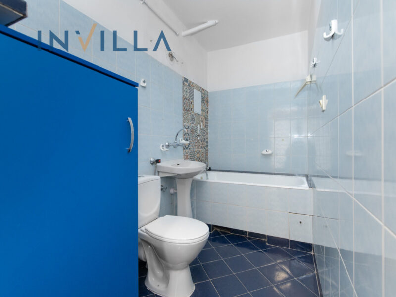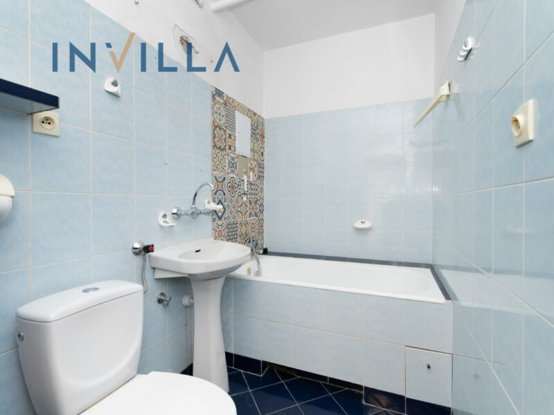 Jak na mieszkanie w bloku łazienka jest duża – swobodnie mieści się wanna, umywalka i WC, jest miejsce na pralkę.