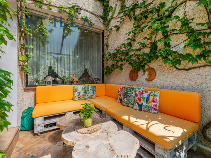 – duży salon z wyjściem na zadaszony taras (możliwość zrobienia ogrodu zimowego) oraz w pełni zagospodarowany ogród 97 m2,