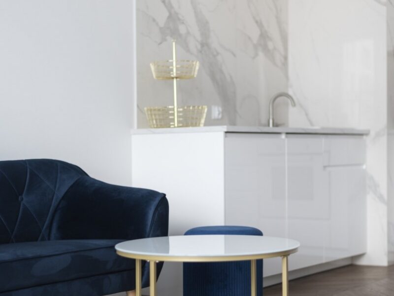 Cały apartament został starannie zaprojektowany z dbałością o każdy detal, a do jego wykończenia zostały użyte najwyższej jakości materiały.