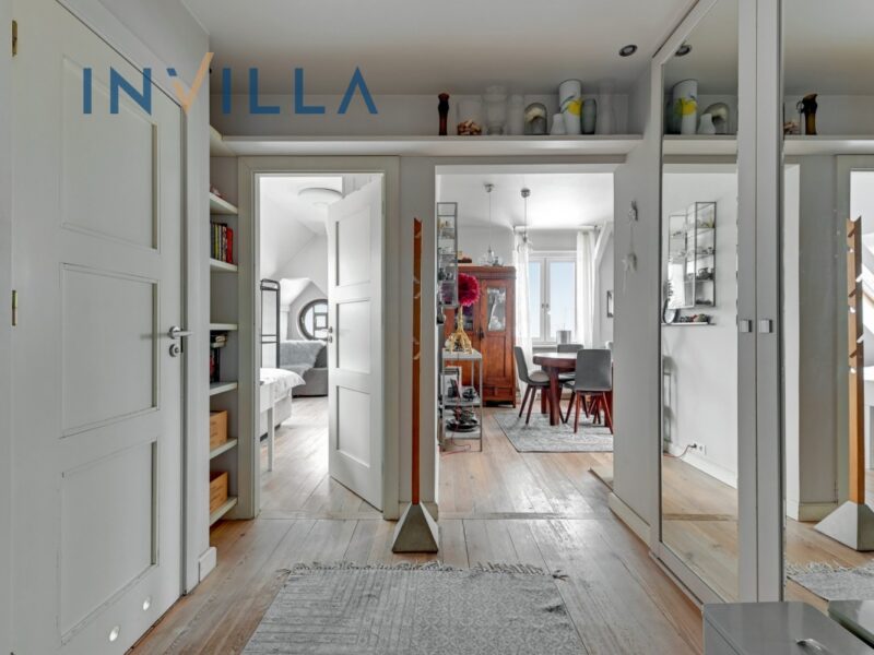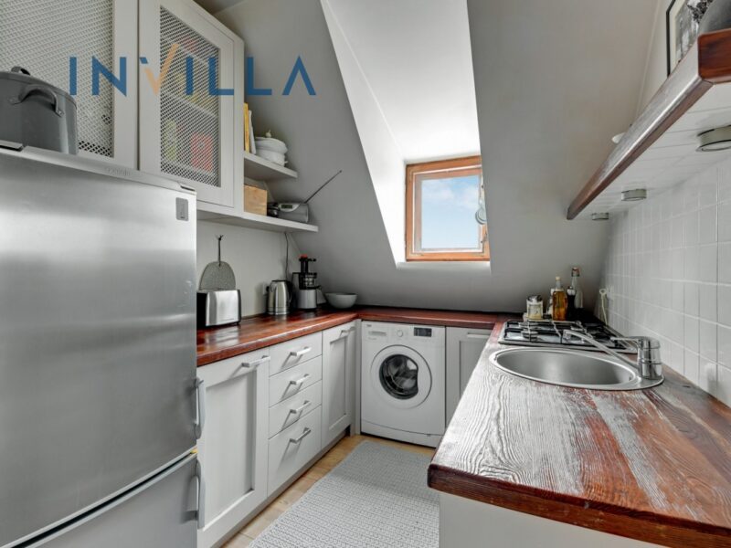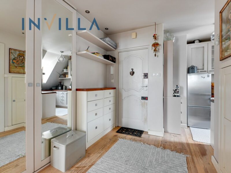 Całkowita powierzchnia pomieszczeń liczona po obrysie podłogi to 49,5 m2. Jest to przemyślana i optymalnie wykorzystana przestrzeń spełniająca funkcję 2-pokojowego mieszkania z odrębną kuchnią i łazienką. Drewniana stuletnia podłoga, funkcjonujący kominek w postaci „kozy”, odsłonięte belki konstrukcyjne, okna w każdym pomieszczeniu, jak również w dachu zapewniające dużo dziennego światła, tworzą klimatyczne wnętrze oddające charakter sopockich kamienic.