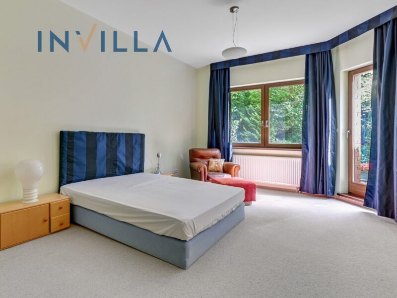 Poziom niżej to część prywatna gdzie znajdują się 3 pokoje, każdy z wyjściem do ogrodu, 2 bardzo duże łazienki, pomieszczenie gospodarcze oraz garderoba i 2 pomieszczenia fitness.