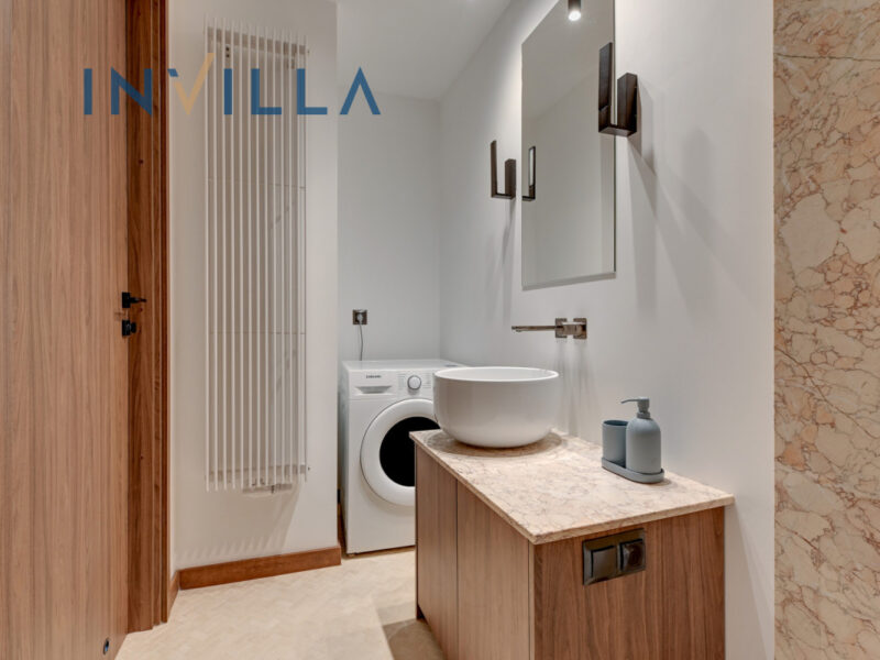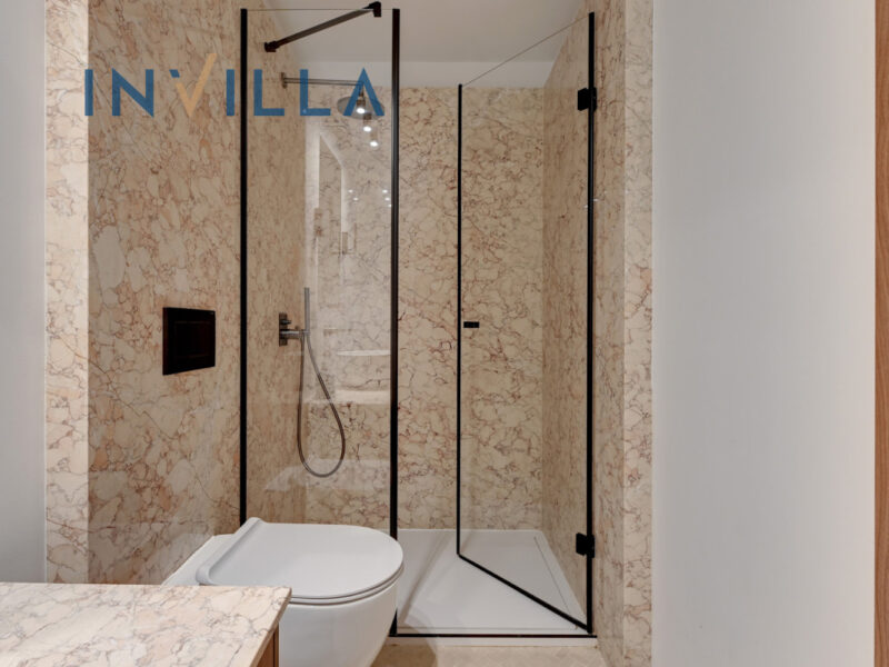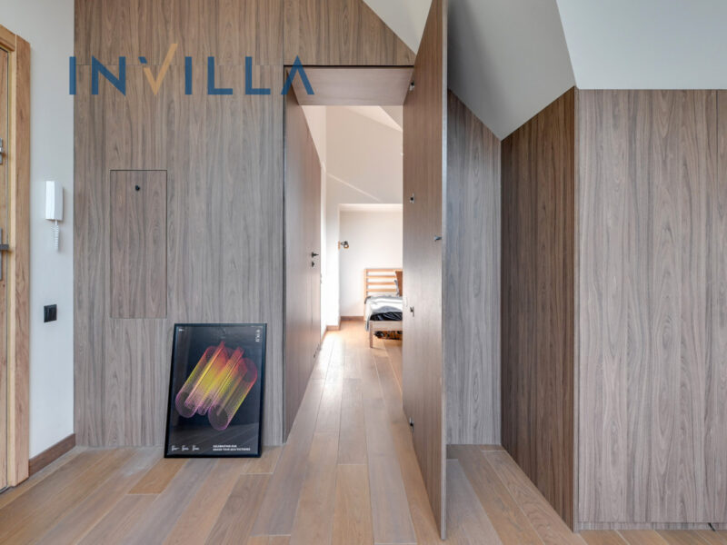 Mieszkanie wykończono w eleganckim, nowoczesnym stylu. Wykorzystano materiały wysokiej klasy, takie jak naturalna deska dębowa klasy prime na podłogach, ceramika włoska Sigmas Vignoni i Saltofaqua Flaminia oraz armatura Ritmonio. Blaty w kuchni to Technistone Crystal Anthracite Pure, parapety i łazienka w marmurze.