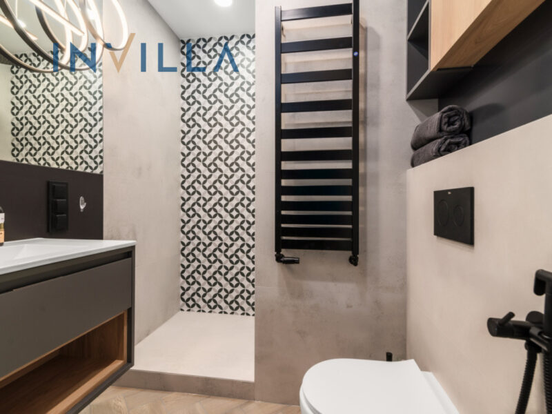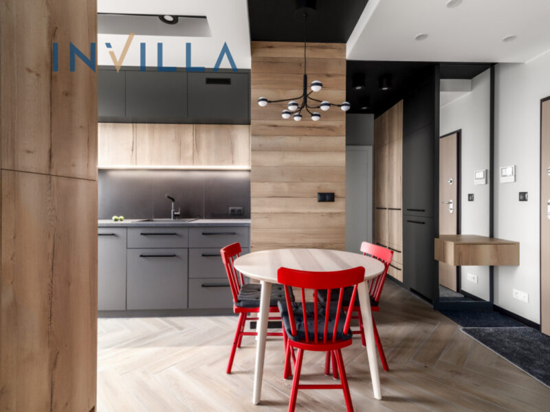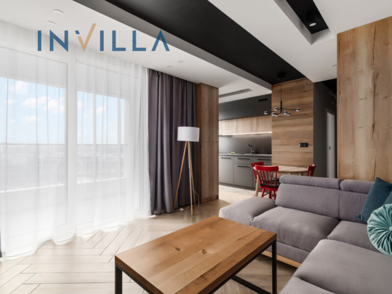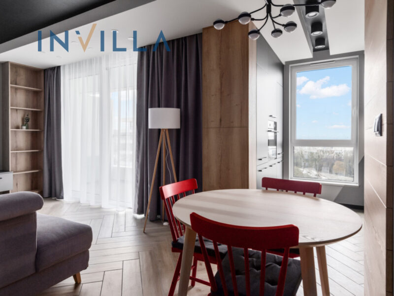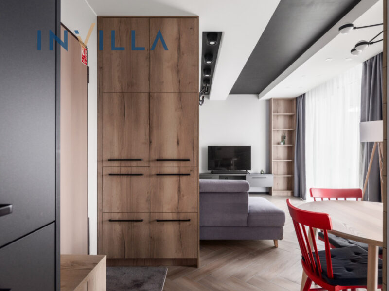 Mieszkanie znajduje się na szesnastym piętrze budynku. Jest nowe, wyposażono we wszystkie najpotrzebniejsze rzeczy i wykończone z najlepszych materiałów w ciepłej, jasnej kolorystyce. Całość́ łączy atrakcyjnie wizualną przestrzeń z funkcjonalnością̨ i interesującym designem. Wszystkie elementy mieszkania funkcjonują̨ ze sobą w harmonii i spójnej estetyce.