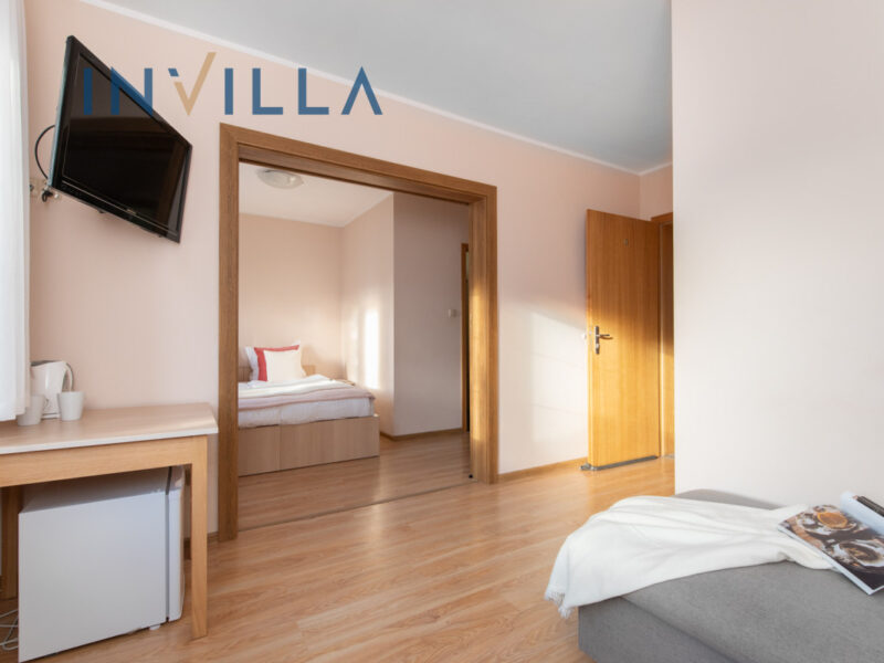 W budynku 2-piętrowym znajduje się 18 pokoi z łazienkami (z możliwością aranżacji do 24 pokoi).