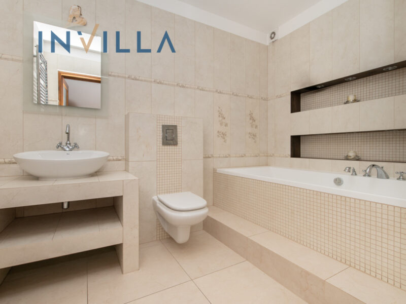 W łazienkach ściany wykończone glazurą, w kuchniach pas glazury nad blatem kuchennym.