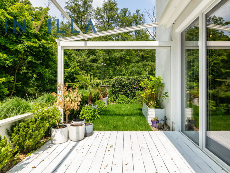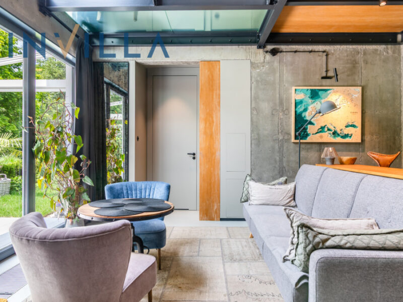 Parter – przestronny pokój dzienny z wysokimi oknami (od podłogi do sufitu), aneks kuchenny w pełni wyposażony, osobna toaleta oraz wyjście na prywatny taras i ogród z widokiem na las.