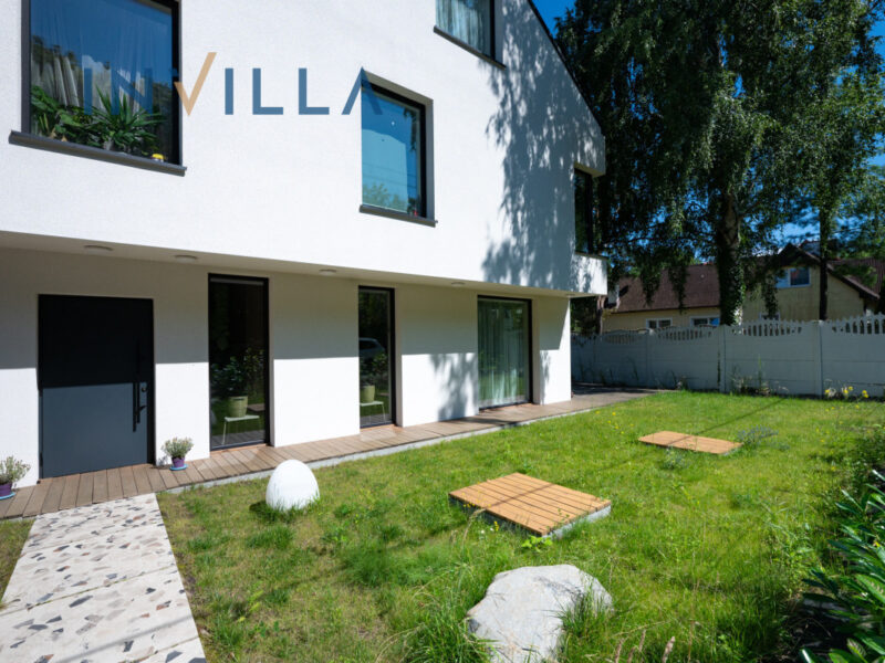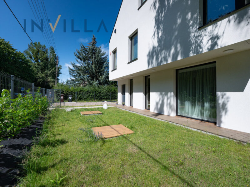 Ogród z estetycznymi nasadzeniami roślin i wygodnym tarasem sprawia, że miejsce to jest idealne do relaksu oraz spotkań rodzinnych i towarzyskich. Na terenie działki znajdują się dwa naziemne miejsca postojowe dostosowane do ładowania aut elektrycznych.