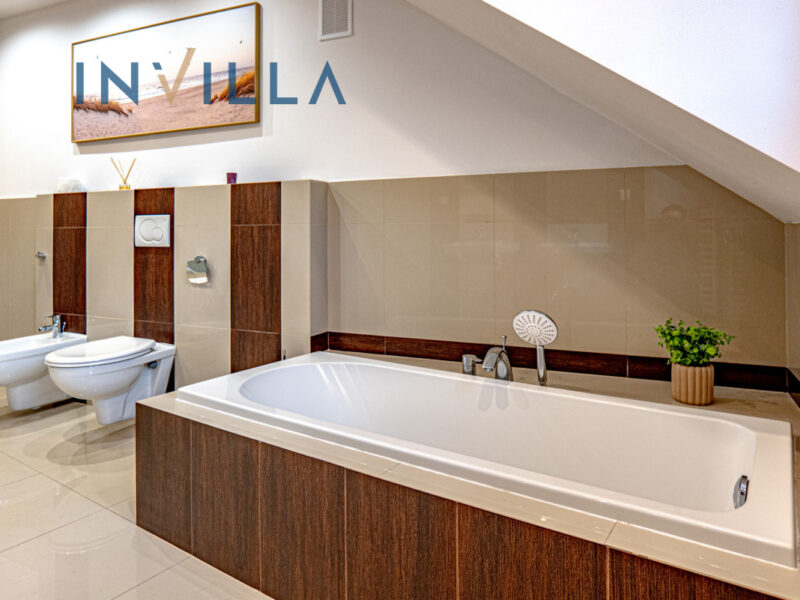 – przestronna łazienka z wanną, prysznicem, bidetem, WC i dwiema umywalkami,