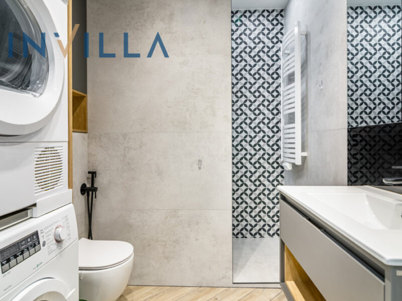 – łazienka z dużym prysznicem oraz pralką i suszarką.