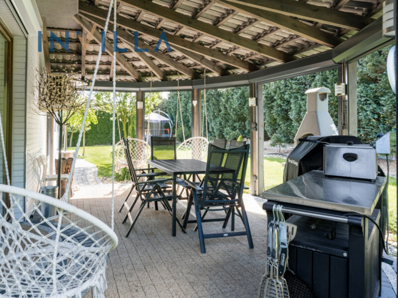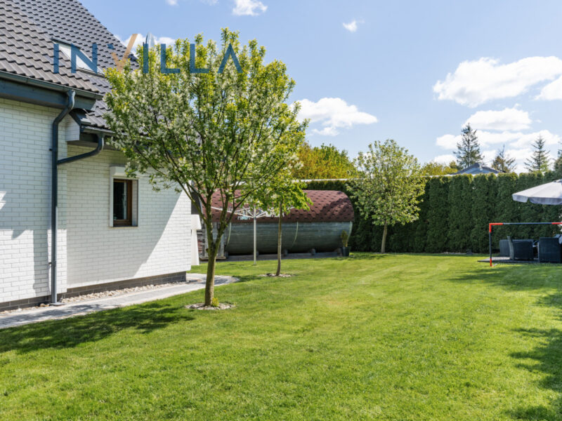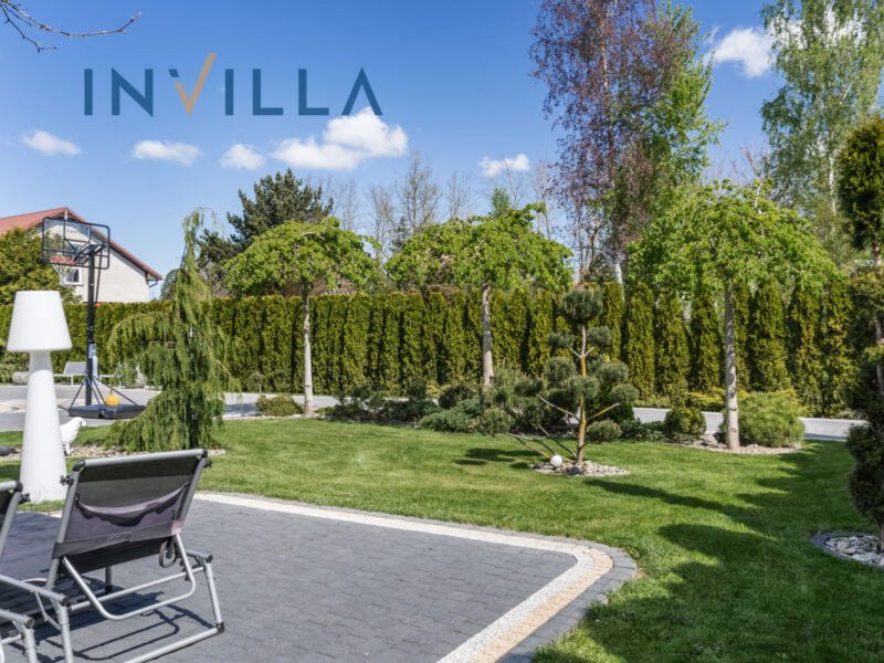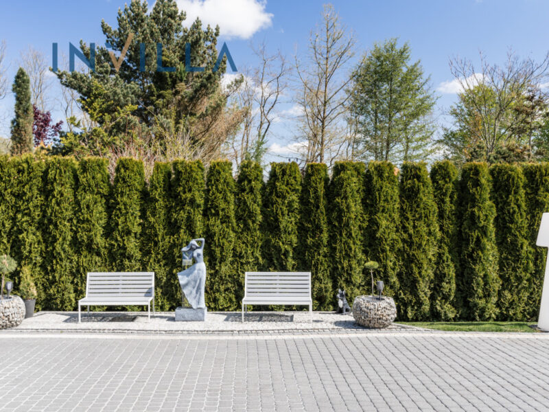 Powierzchnia działki to 1795 m², na których starannie zaprojektowano i zrealizowano przestrzeń wokół budynku. Teren został całkowicie ogrodzony, wyposażony w monitoring i system automatycznego nawadniania ogrodu. Znajdujący się za domem taras wypoczynkowy z grillem i zadaszeniem zapewnia idealne warunki do spędzania czasu na świeżym powietrzu. Dodatkowo na działce znajduje się sauna. Na drugiej części działki znajduje się budynek z garażem i dwupoziomową siłownią. Ponadto na tym budynku położone są panele fotowoltaiczne o mocy 20 kW.