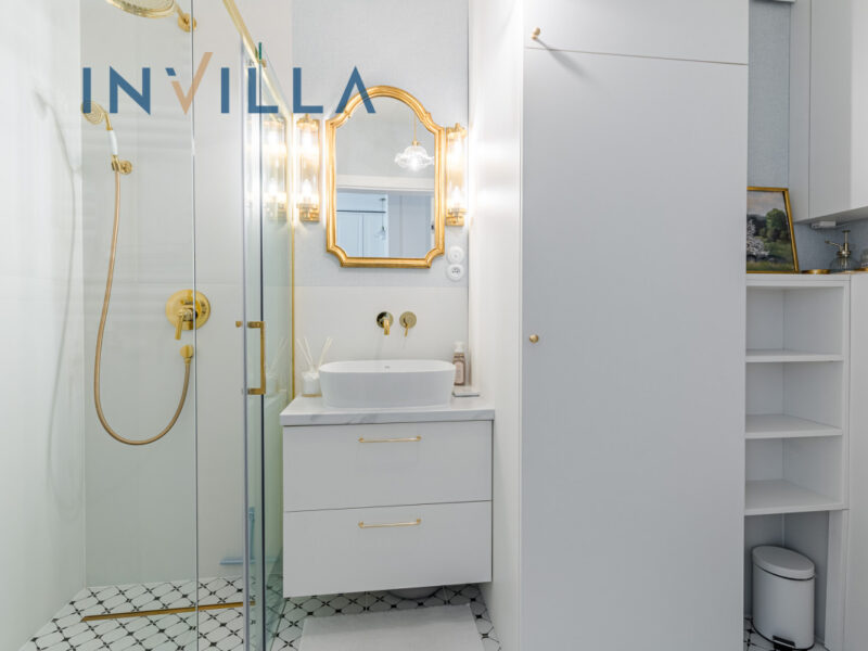 Łazienka (4,90 m²) – elegancka i funkcjonalna, z przestronną kabiną prysznicową (110 x 80 cm), odpływem liniowym oraz armaturą w stylu retro. Nad umywalką umieszczono dwa kinkiety oraz lustro, a dodatkowa zabudowa umożliwia estetyczne ukrycie pralki i suszarki.