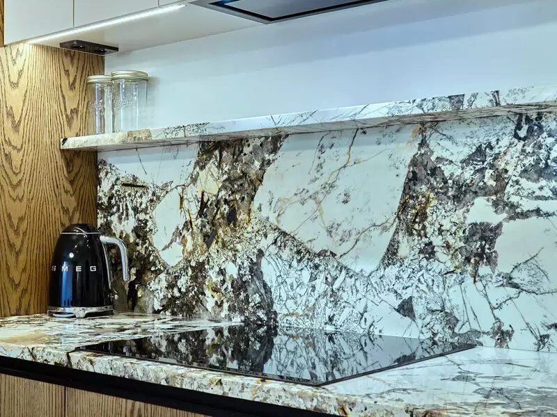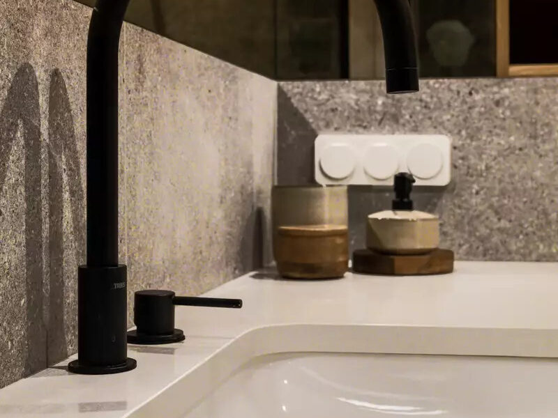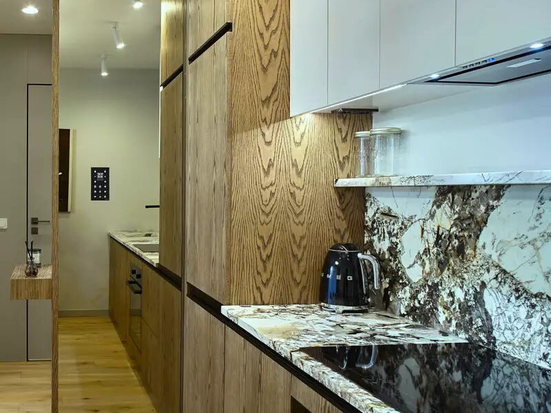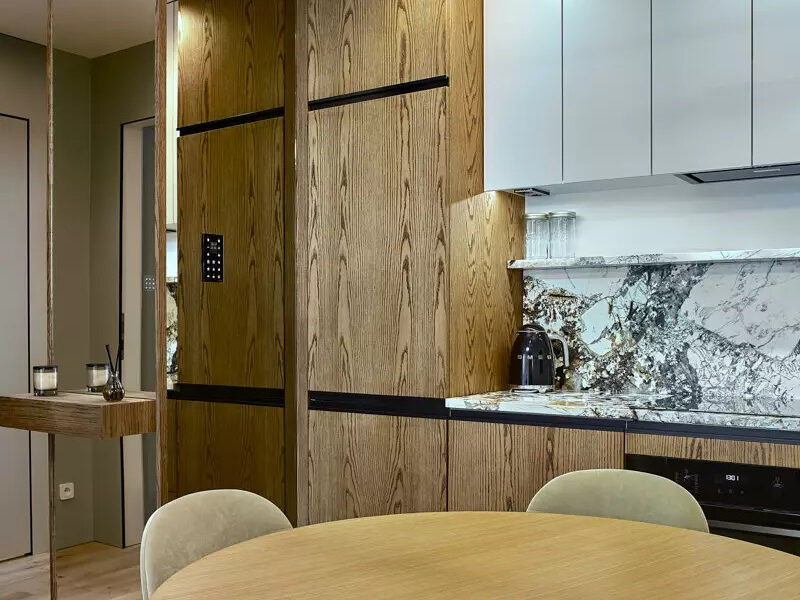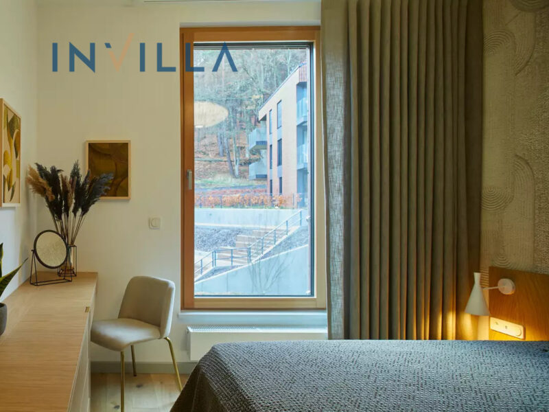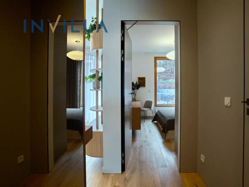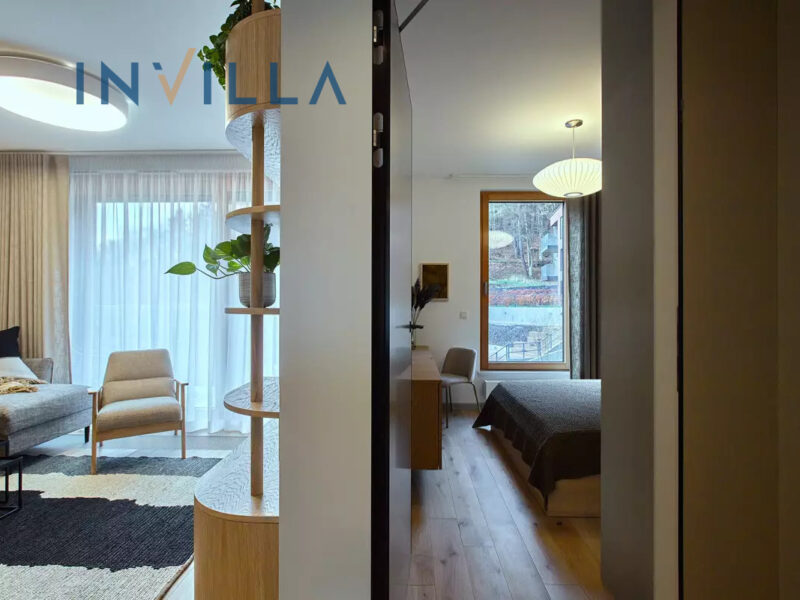 Apartament mieści się na pierwszym piętrze nowoczesnego budynku z 2021 roku. Został zaprojektowany w stylu Japandi, gdzie naturalne drewno, jasne kolory i miękkie tkaniny tworzą atmosferę przytulnego spokoju, a kontrastowe wykończenia z naturalnego kamienia nadają wnętrzu wyrafinowanego charakteru. Panoramiczne, drewniane okna o ponadstandardowych wymiarach wypełniają przestrzeń światłem i otwierają widok na otaczającą zieleń. Z salonu prowadzi wyjście na słoneczny taras od strony południowo-zachodniej – idealne miejsce na popołudniowy relaks.