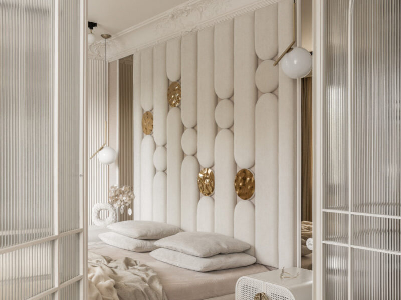 • klimatyczna, elegancka sypialnia z dużym tapicerowanym łóżkiem i przepięknym oświetleniem,