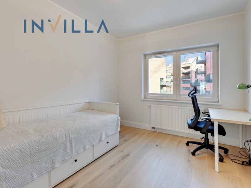Druga część to sypialnia z dwuosobowym łóżkiem, z której można wyjść na balkon od strony patio oraz pokój, który idealnie sprawdzi się jako gabinet do pracy, sypialnia czy pokój dziecięcy.