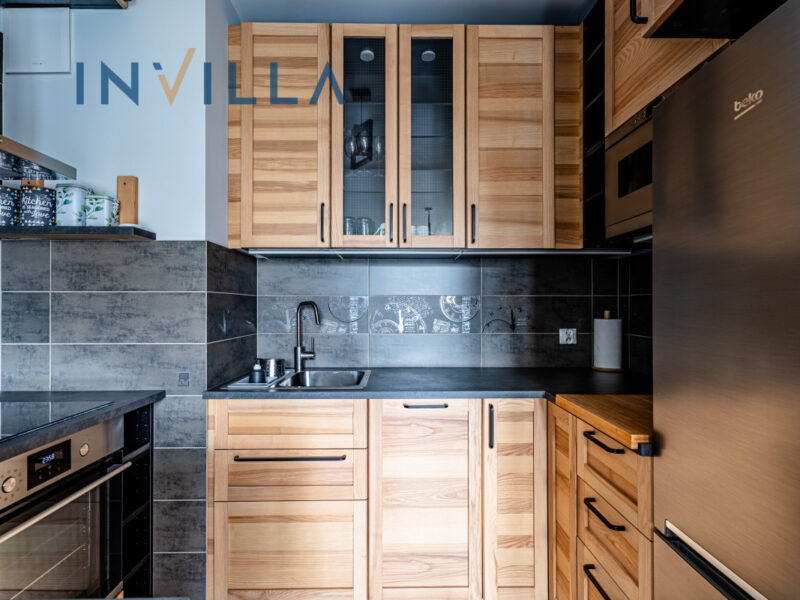 Mieszkanie jest w pełni umeblowane i wyposażone w meble i sprzęt AGD (lodówka, kuchenka z piekarnikiem, zmywarka, pralka, telewizor). W przedpokoju oraz w sypialni są szafy typu Komandor.