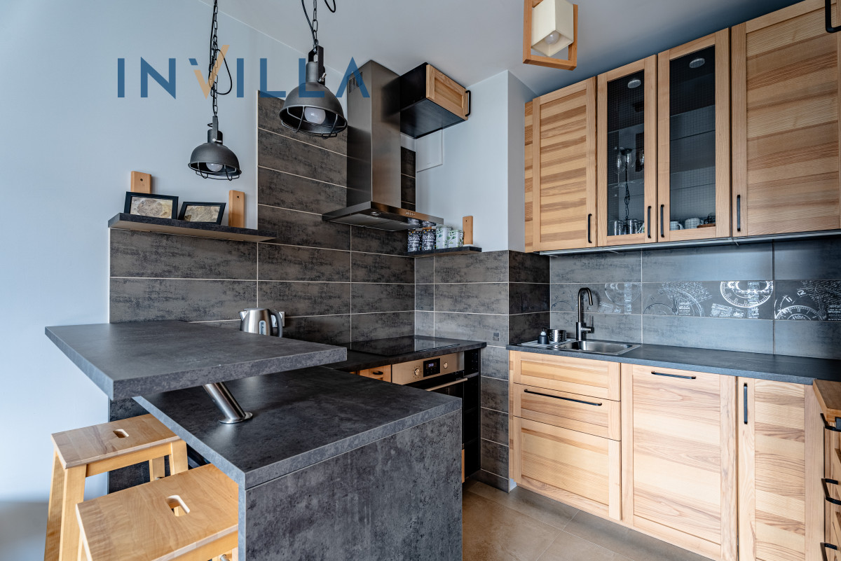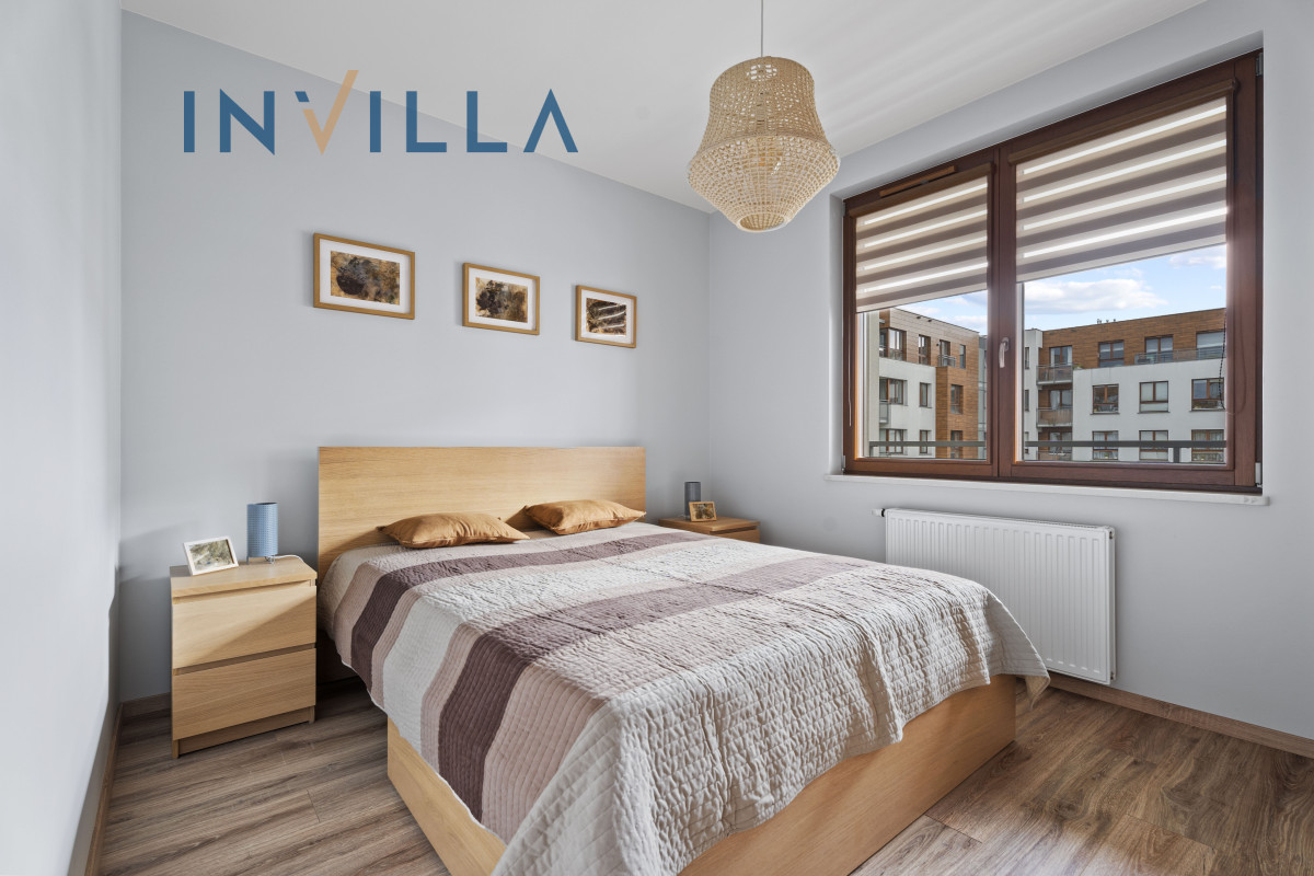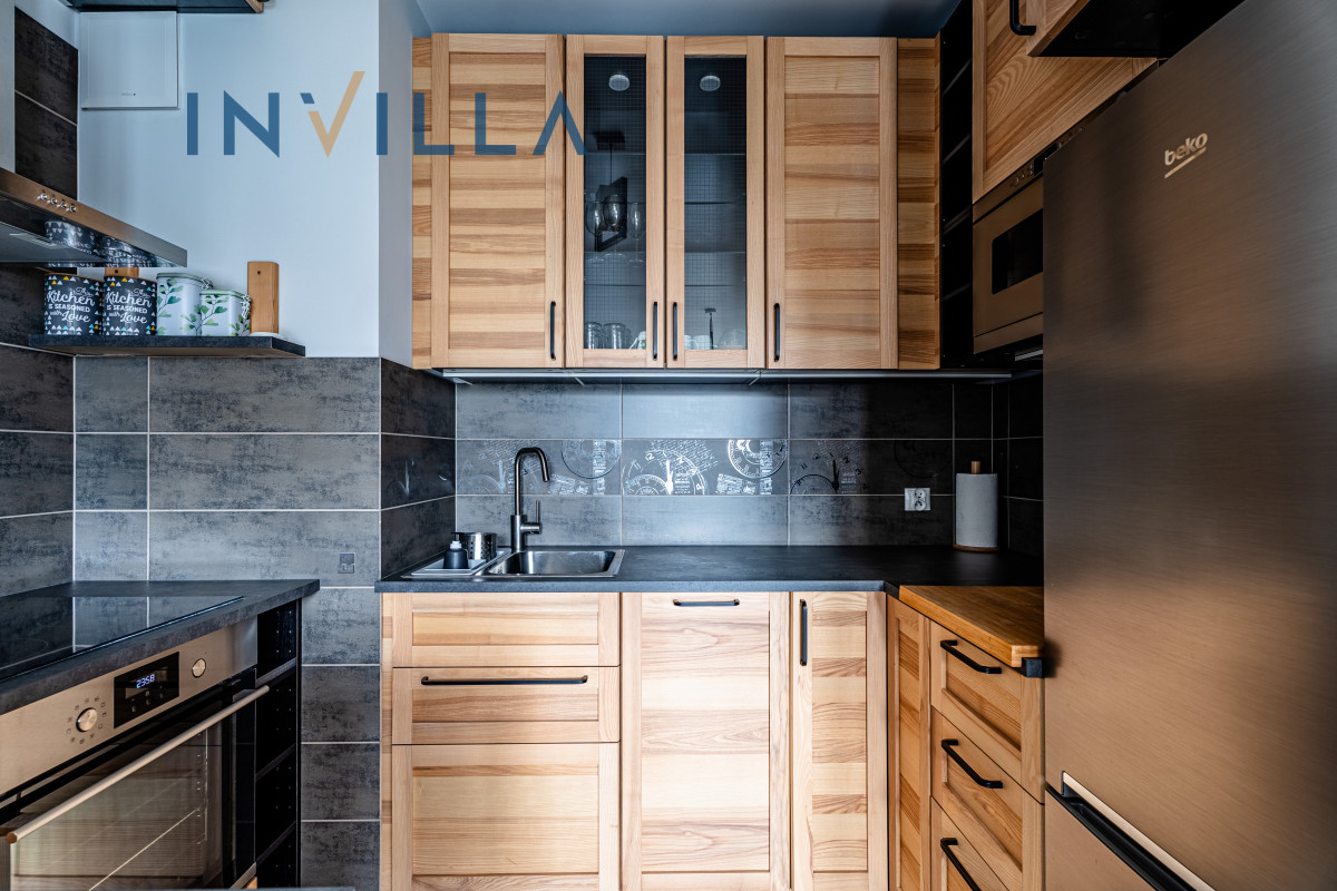 Mieszkanie jest w pełni umeblowane i wyposażone w meble i sprzęt AGD (lodówka, kuchenka z piekarnikiem, zmywarka, pralka, telewizor). W przedpokoju oraz w sypialni są szafy typu Komandor.