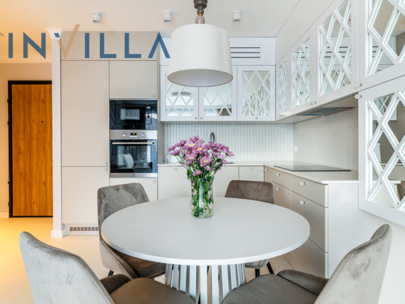 – salon z w pełni wyposażonym aneksem kuchennym (piekarnik, mikrofalówka, lodówka, zmywarka, płyta indukcyjna),