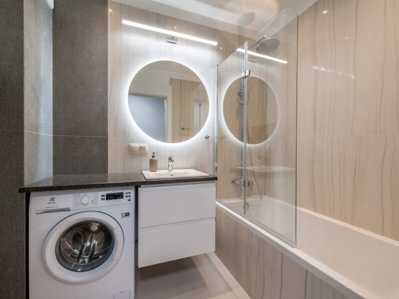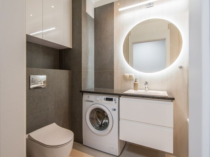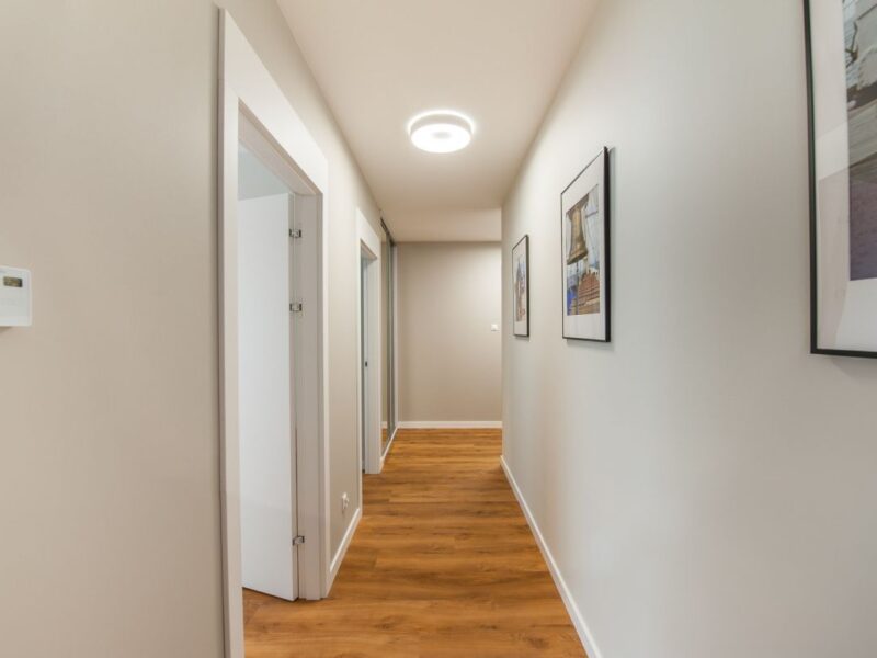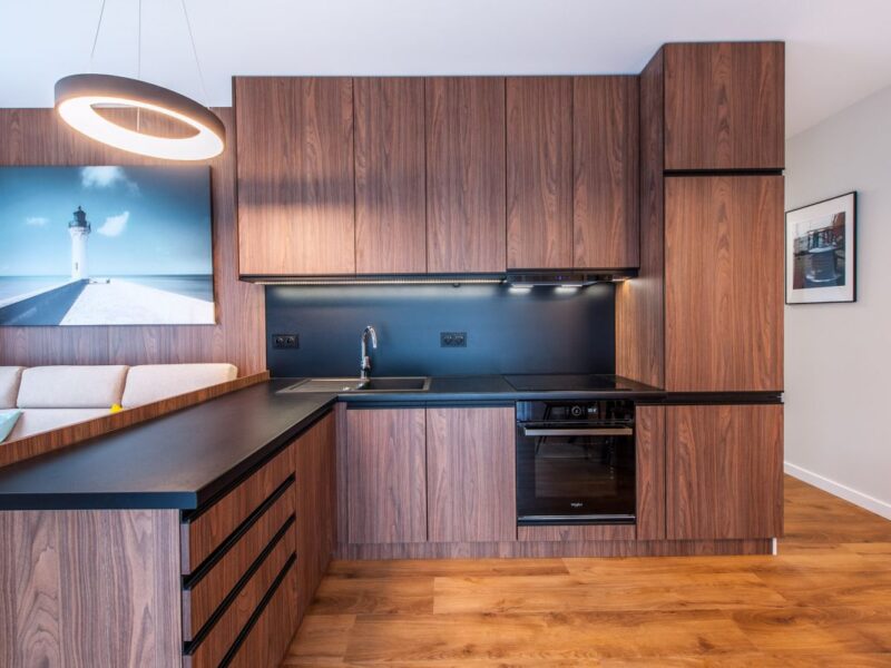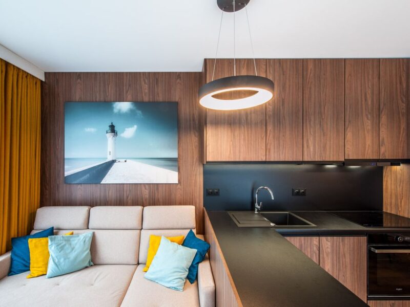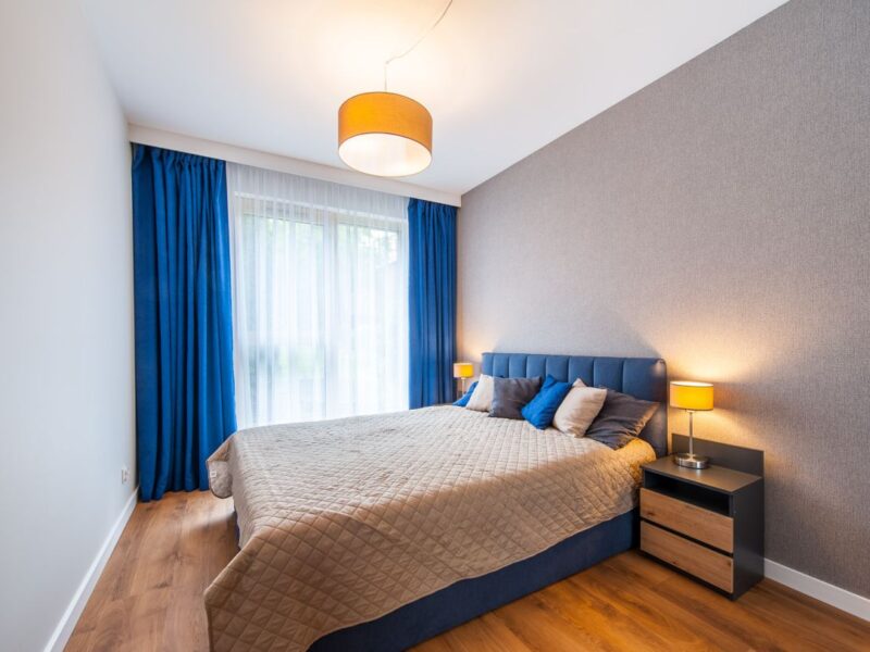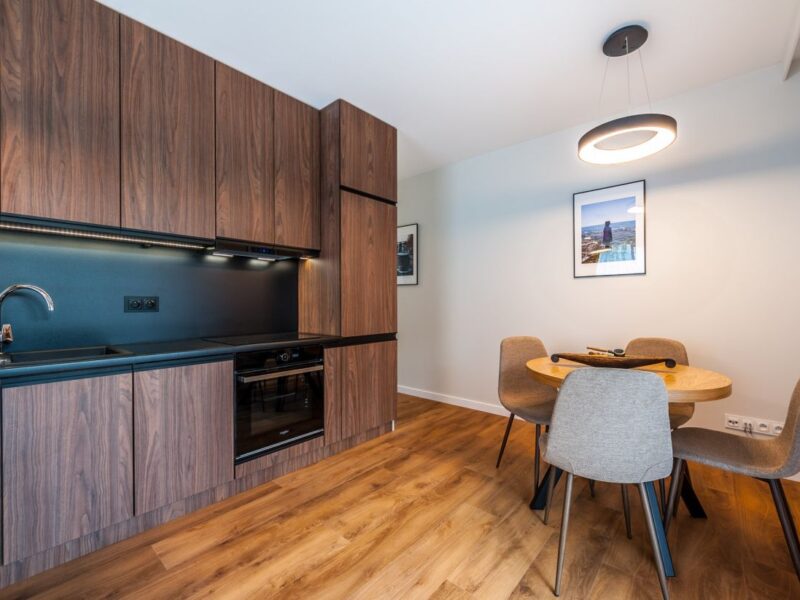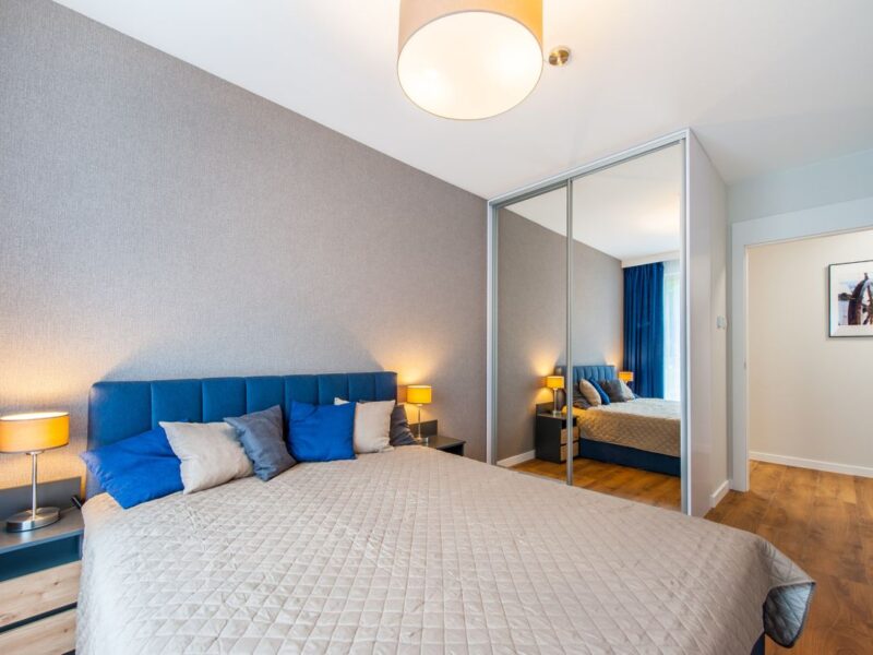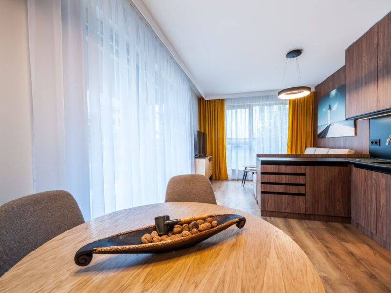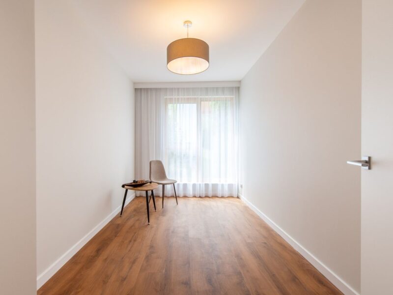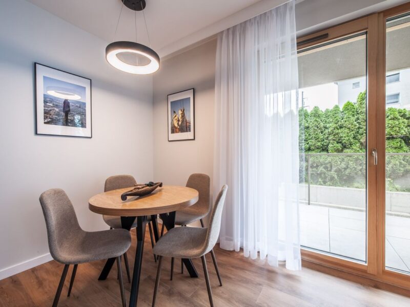 Nigdy nie użytkowane, świeżo wykończone mieszkanie, położone na 1. piętrze. W części głównej znajduje się salon z funkcjonalnym aneksem kuchennym, oddzielony poprzez wyspę z częścią wypoczynkową. Dzięki zastosowanemu rozkładowi pomieszczenia znajduje się tam również pełnowymiarowy stół. Kuchnia wyposażone w pełne AGD (zmywarka, płyta indukcyjna, piekarnik, duża lodówka). Całe pomieszczenie jest bardzo dobrze doświetlone, dzięki południowej ekspozycji oraz dużej ilości wysokich okien. Pozostałe pomieszczenia to umeblowana sypialnia z dużą szafą, pokój który może pełnić funkcję drugiej sypialni lub np. gabinetu, przestronny hall z szafą oraz łazienka wyposażona w wannę z przesłoną prysznicową.