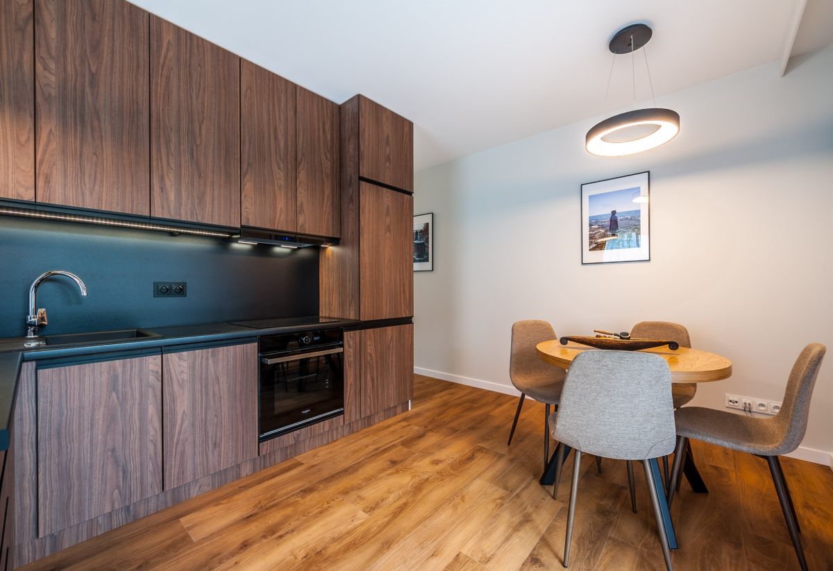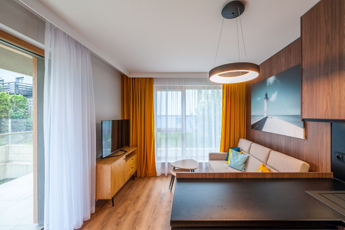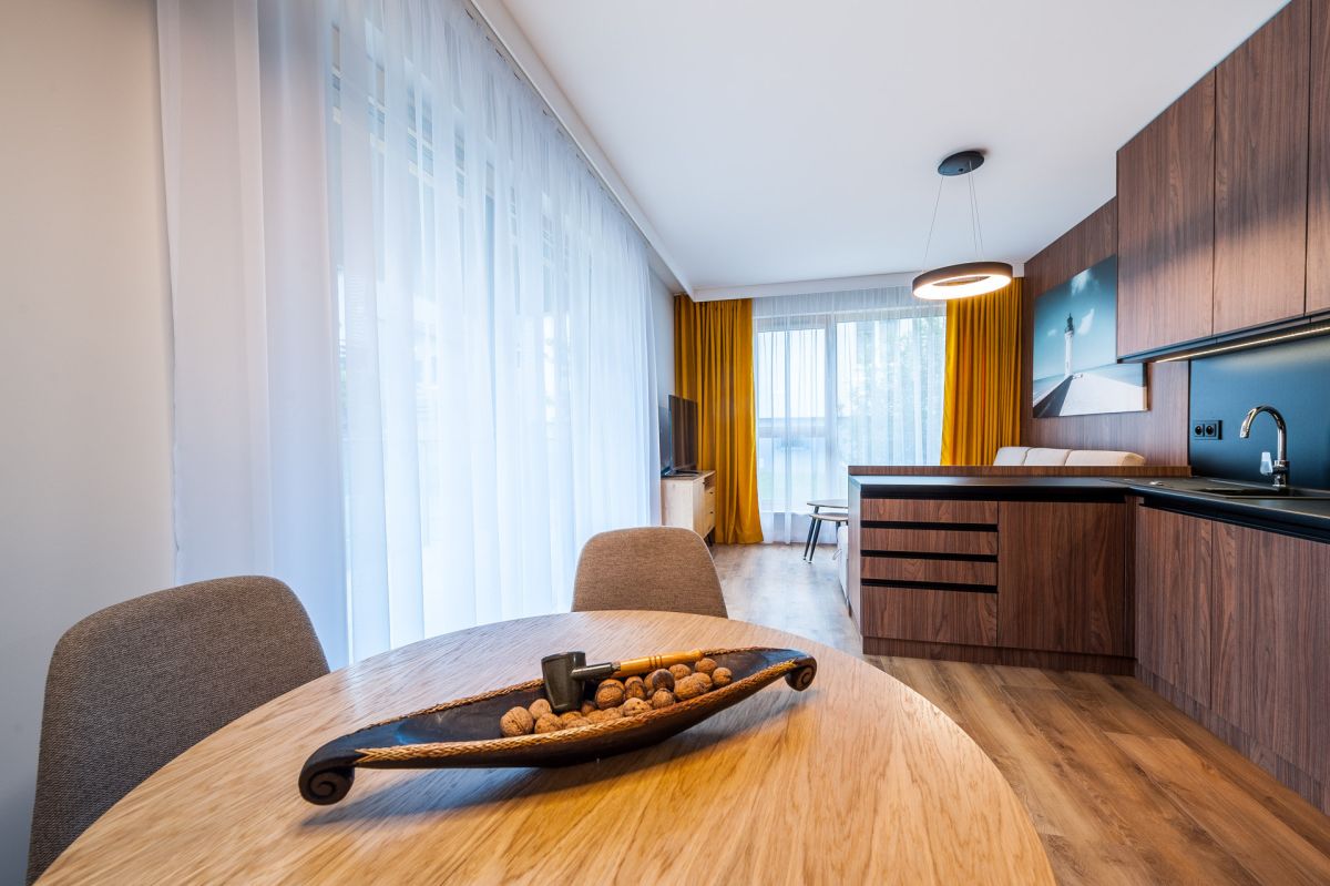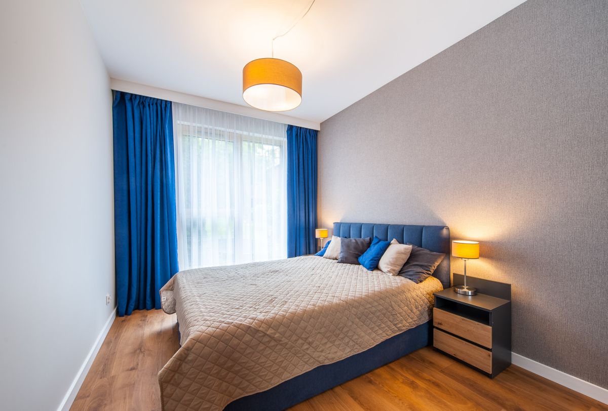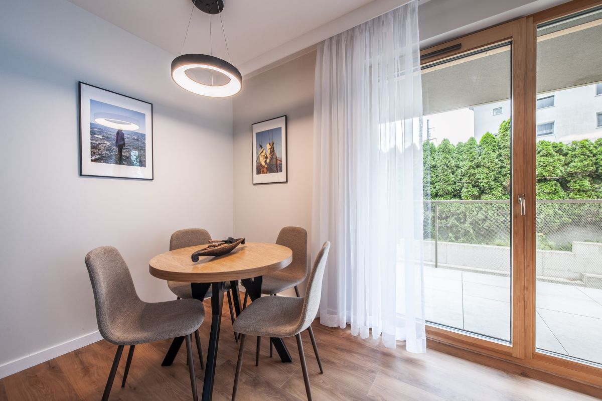 Nigdy nie użytkowane, świeżo wykończone mieszkanie, położone na 1. piętrze. W części głównej znajduje się salon z funkcjonalnym aneksem kuchennym, oddzielony poprzez wyspę z częścią wypoczynkową. Dzięki zastosowanemu rozkładowi pomieszczenia znajduje się tam również pełnowymiarowy stół. Kuchnia wyposażone w pełne AGD (zmywarka, płyta indukcyjna, piekarnik, duża lodówka). Całe pomieszczenie jest bardzo dobrze doświetlone, dzięki południowej ekspozycji oraz dużej ilości wysokich okien. Pozostałe pomieszczenia to umeblowana sypialnia z dużą szafą, pokój który może pełnić funkcję drugiej sypialni lub np. gabinetu, przestronny hall z szafą oraz łazienka wyposażona w wannę z przesłoną prysznicową.