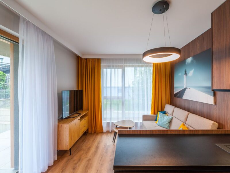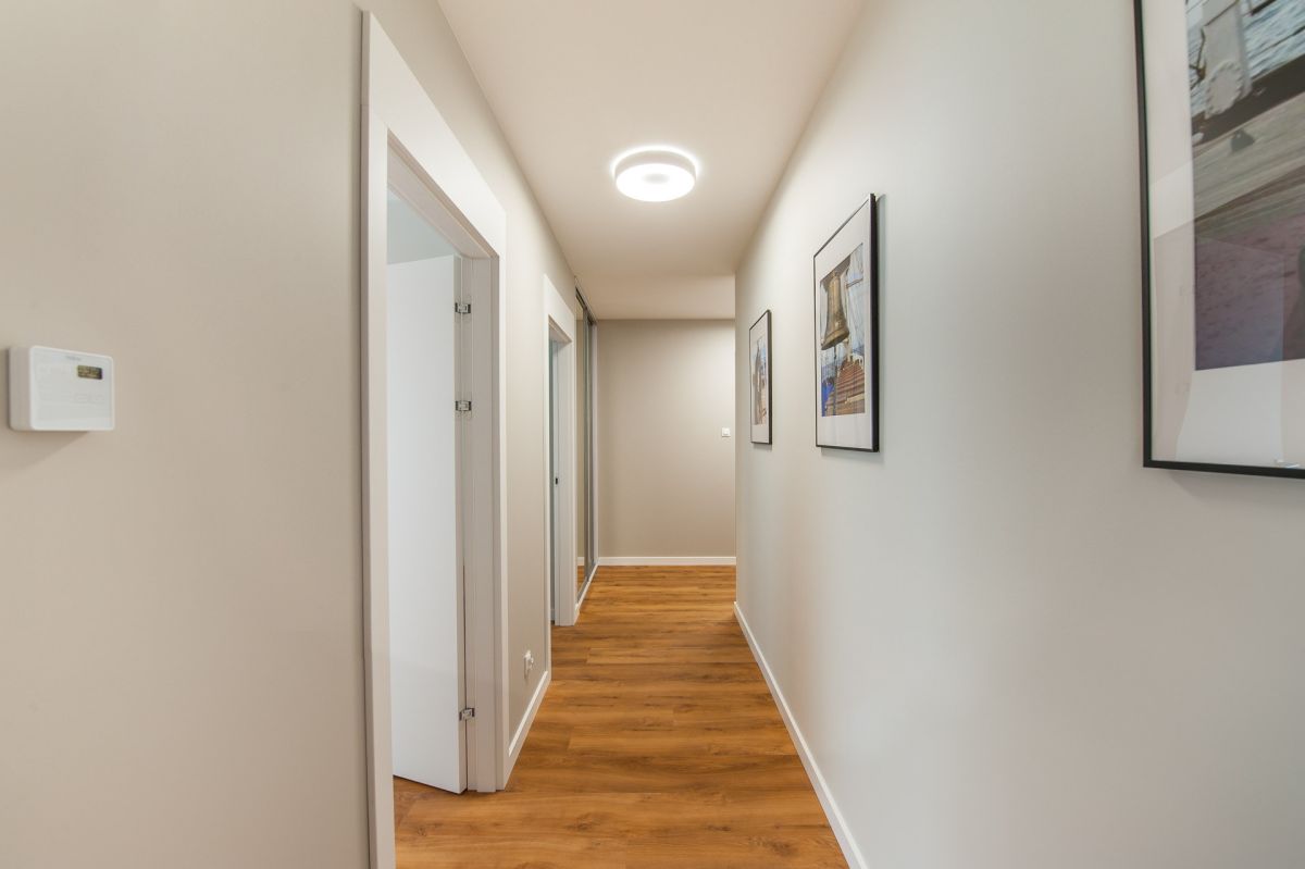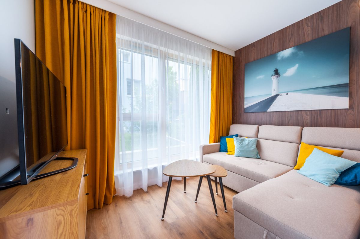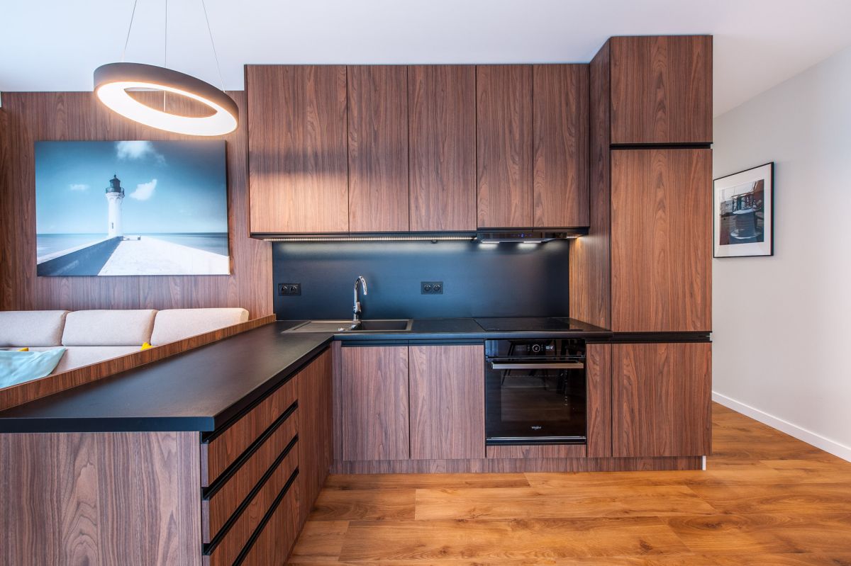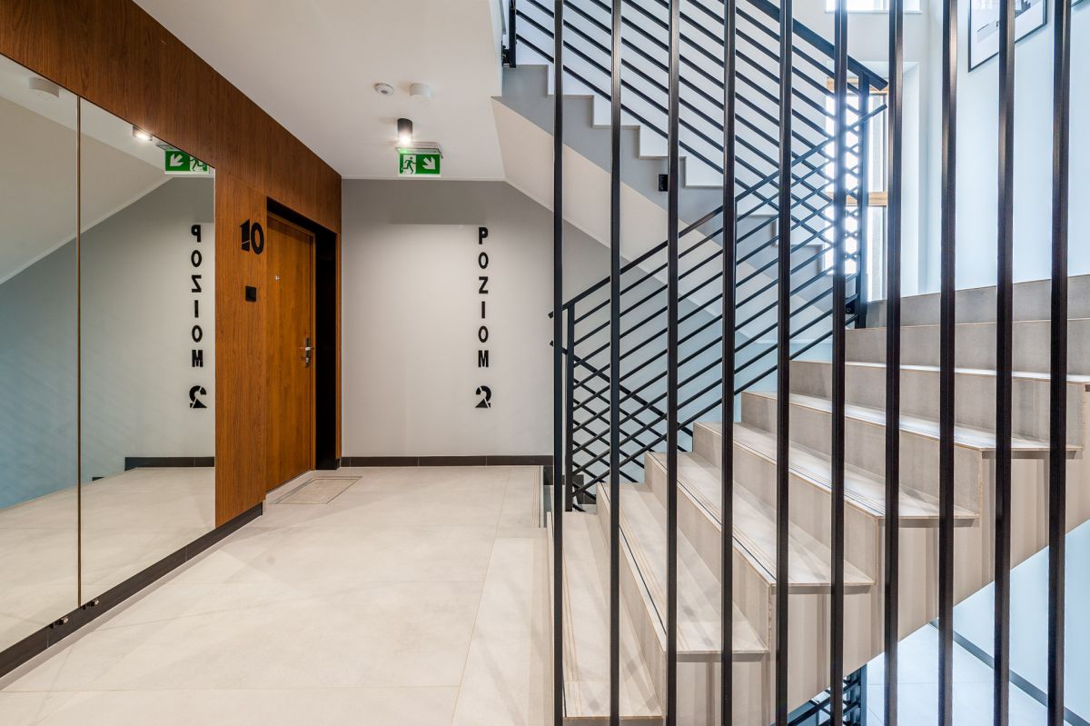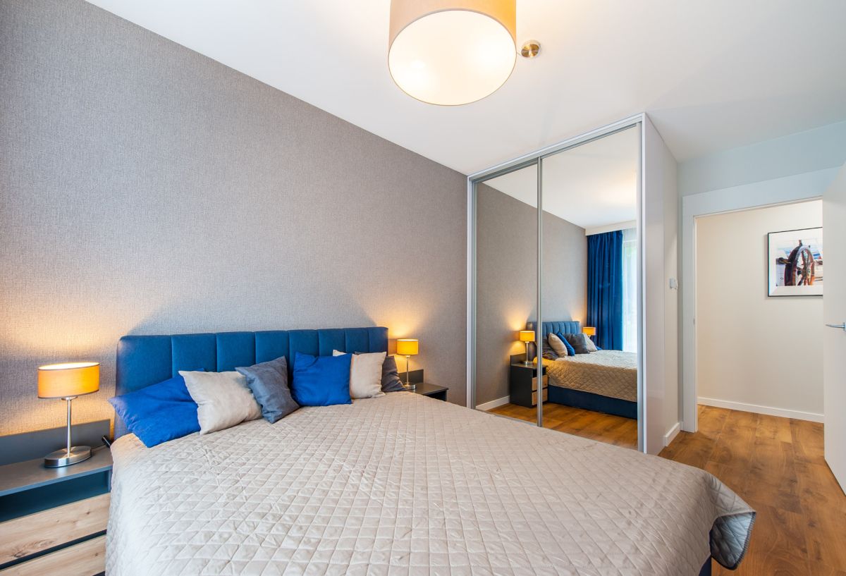 Nigdy nie użytkowane, świeżo wykończone mieszkanie, położone na 1. piętrze. W części głównej znajduje się salon z funkcjonalnym aneksem kuchennym, oddzielony poprzez wyspę z częścią wypoczynkową. Dzięki zastosowanemu rozkładowi pomieszczenia znajduje się tam również pełnowymiarowy stół. Kuchnia wyposażone w pełne AGD (zmywarka, płyta indukcyjna, piekarnik, duża lodówka). Całe pomieszczenie jest bardzo dobrze doświetlone, dzięki południowej ekspozycji oraz dużej ilości wysokich okien. Pozostałe pomieszczenia to umeblowana sypialnia z dużą szafą, pokój który może pełnić funkcję drugiej sypialni lub np. gabinetu, przestronny hall z szafą oraz łazienka wyposażona w wannę z przesłoną prysznicową.