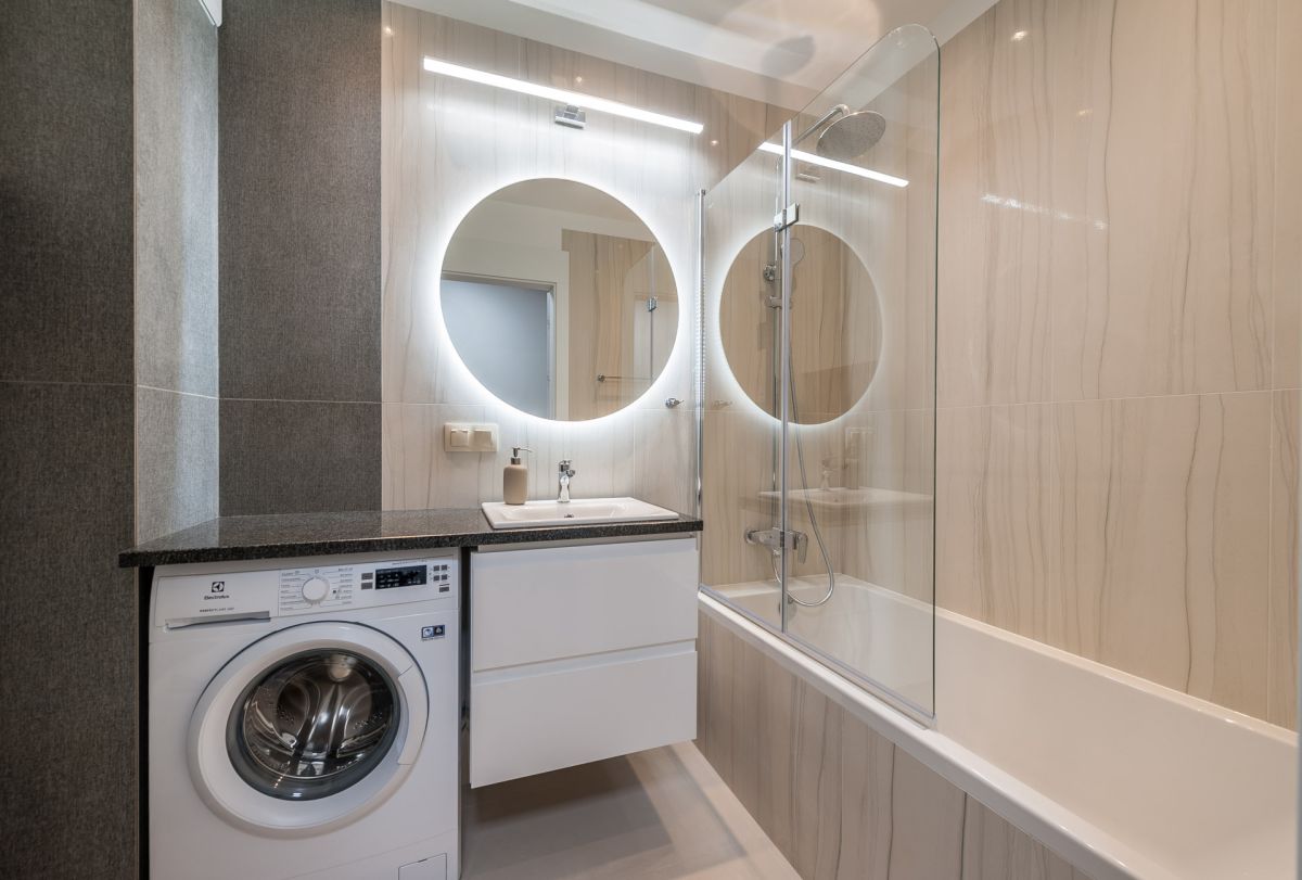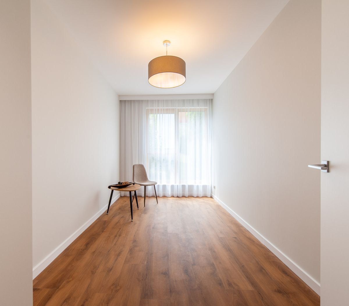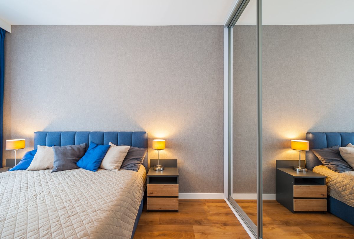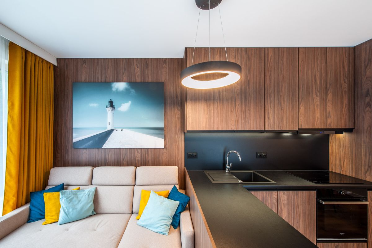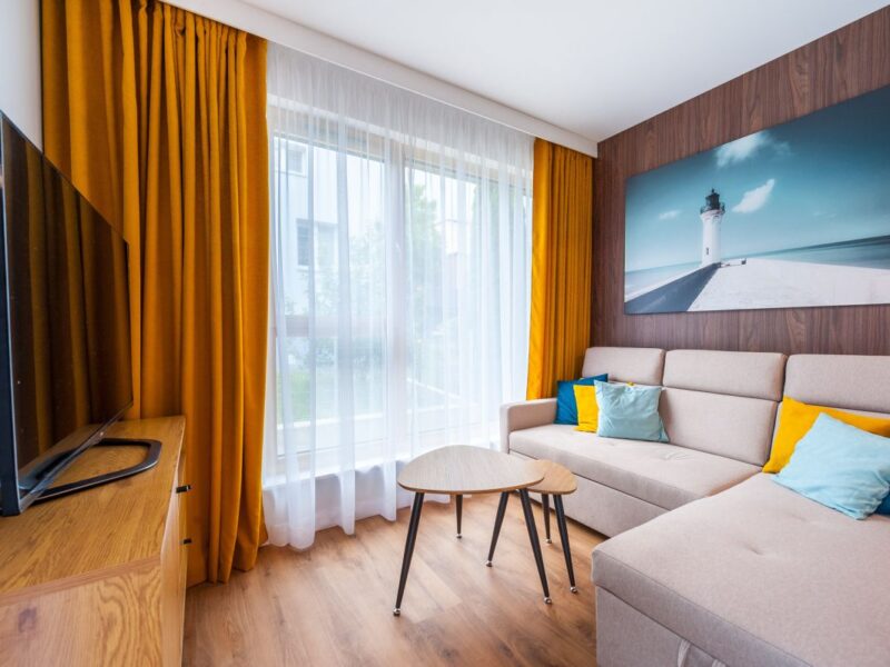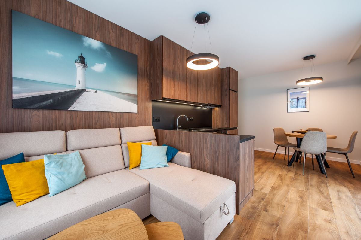 Nigdy nie użytkowane, świeżo wykończone mieszkanie, położone na 1. piętrze. W części głównej znajduje się salon z funkcjonalnym aneksem kuchennym, oddzielony poprzez wyspę z częścią wypoczynkową. Dzięki zastosowanemu rozkładowi pomieszczenia znajduje się tam również pełnowymiarowy stół. Kuchnia wyposażone w pełne AGD (zmywarka, płyta indukcyjna, piekarnik, duża lodówka). Całe pomieszczenie jest bardzo dobrze doświetlone, dzięki południowej ekspozycji oraz dużej ilości wysokich okien. Pozostałe pomieszczenia to umeblowana sypialnia z dużą szafą, pokój który może pełnić funkcję drugiej sypialni lub np. gabinetu, przestronny hall z szafą oraz łazienka wyposażona w wannę z przesłoną prysznicową.