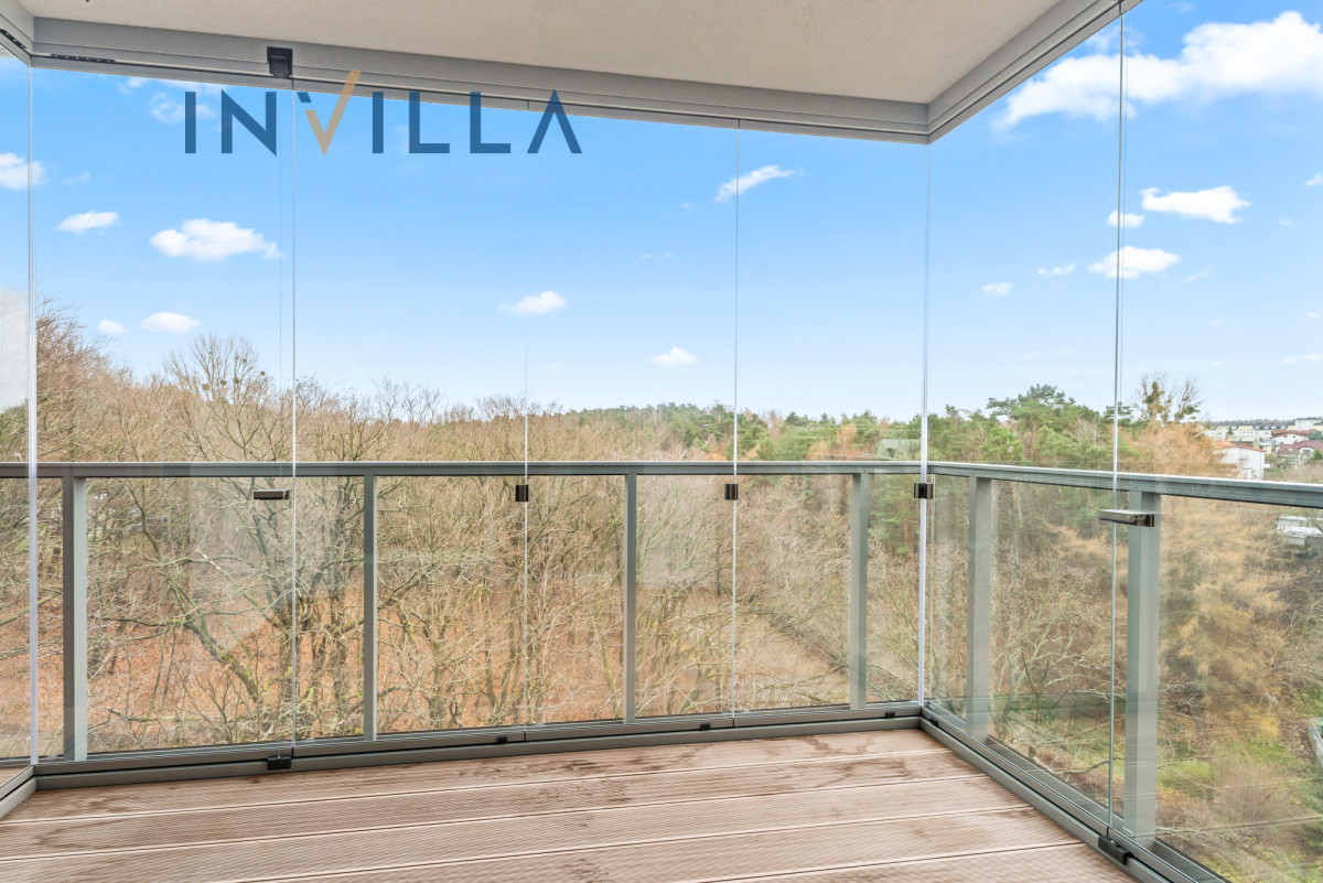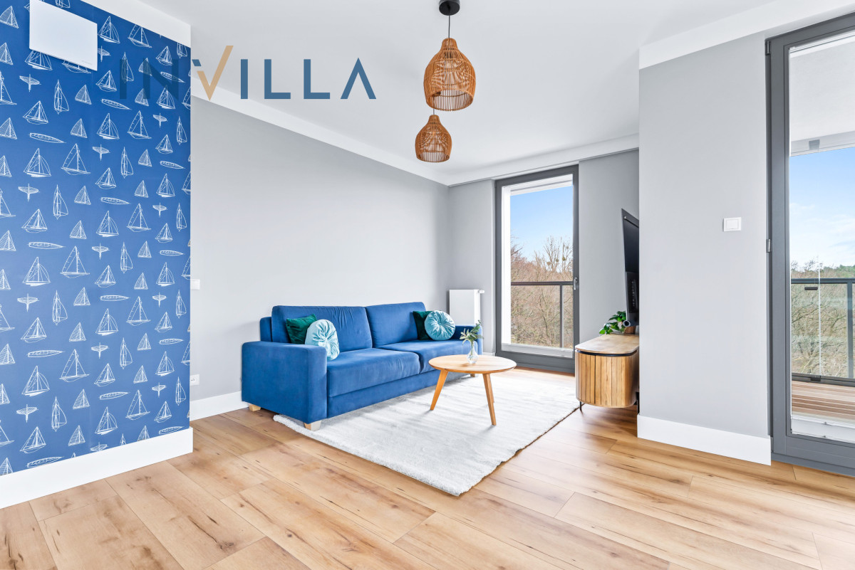 – przestronny salon z rozkładaną sofą i wyjściem na balkon z widokiem na zieleń,