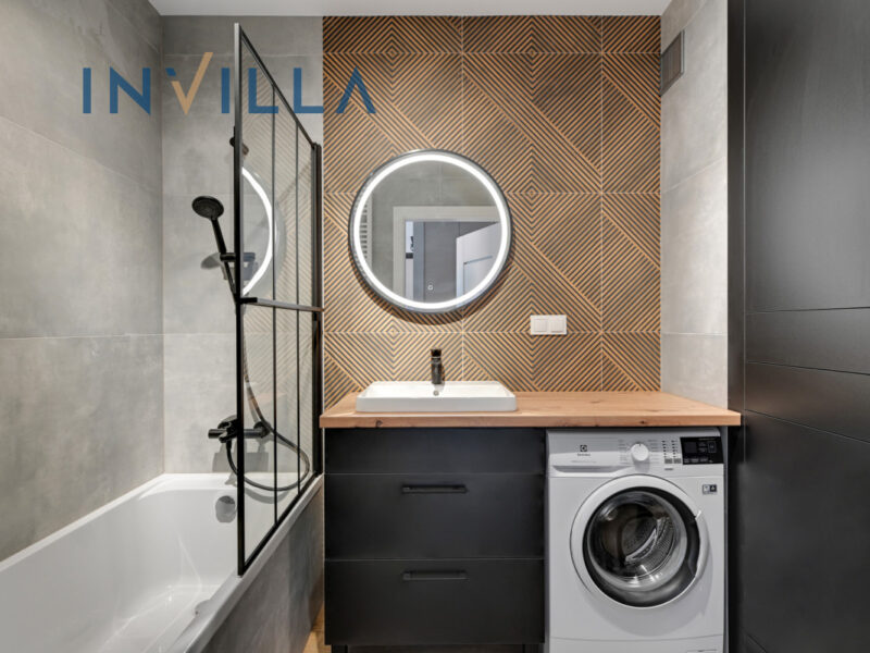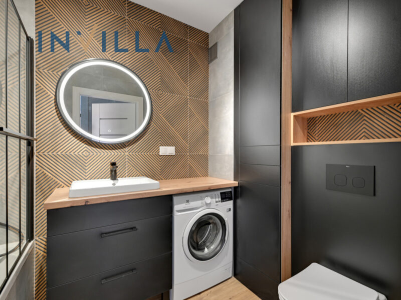 Zabudowa kuchenna, łazienkowa i przedpokojowa zostały wykonane na wymiar przez stolarza. Mieszkanie wyposażone również w sprzęt AGD (zmywarka, piekarnik, płyta elektryczna, okap, lodówka i pralka).