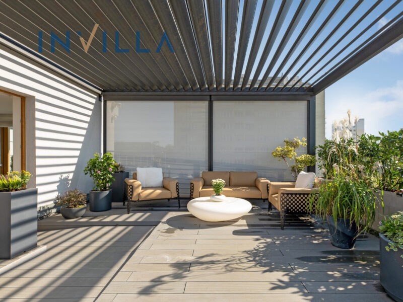 • Taras: Przestronny, około 120 m² taras z pergolą wyposażoną w elektryczny dach i rolety, zapewniające prywatność. Idealne miejsce do relaksu lub spotkań w gronie bliskich.