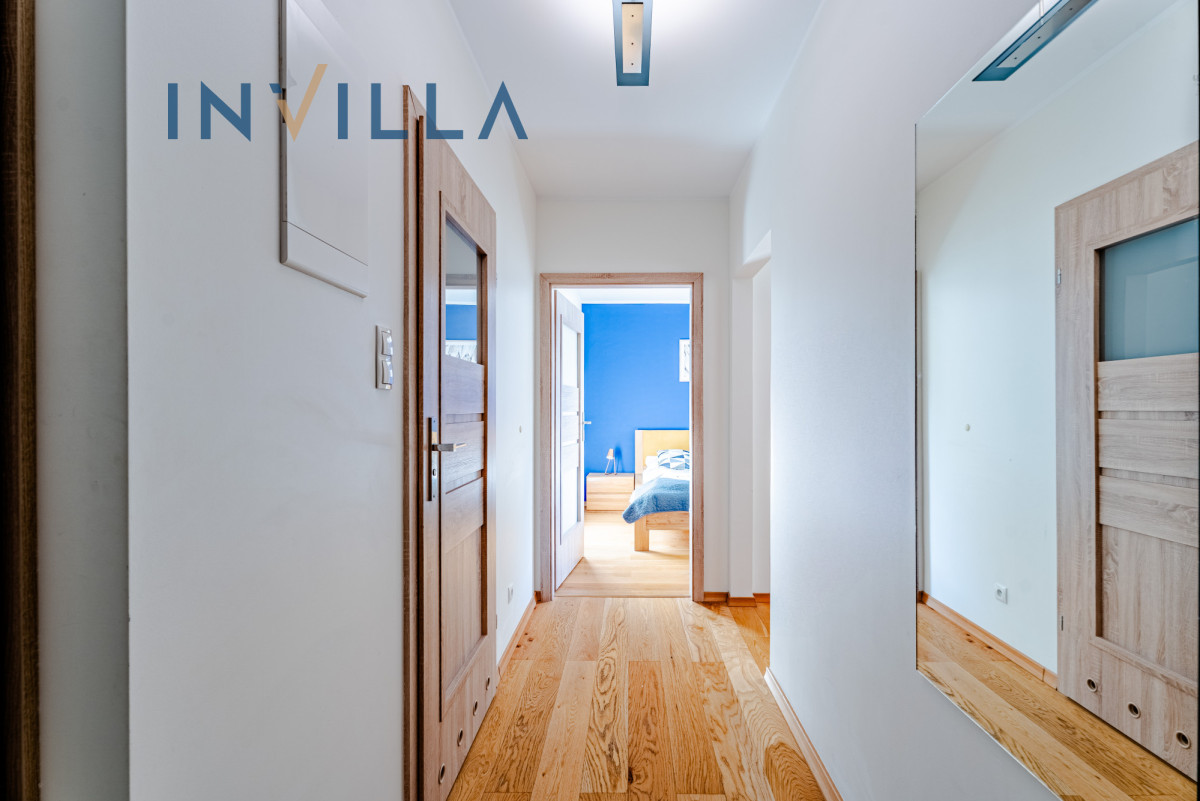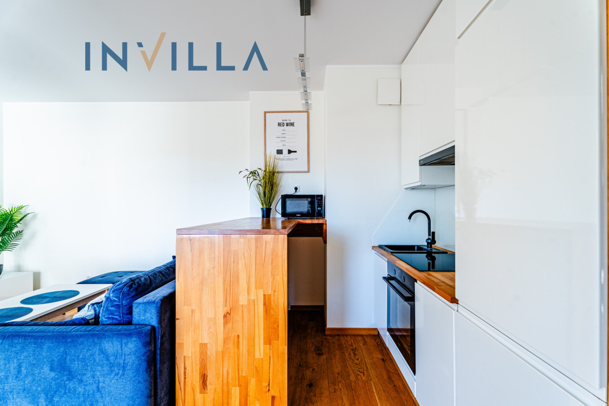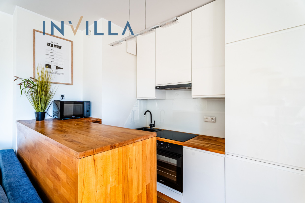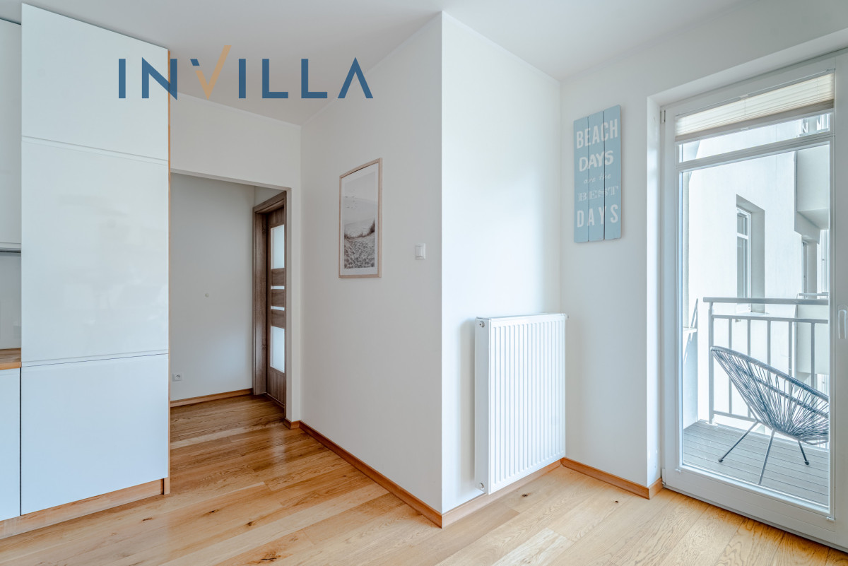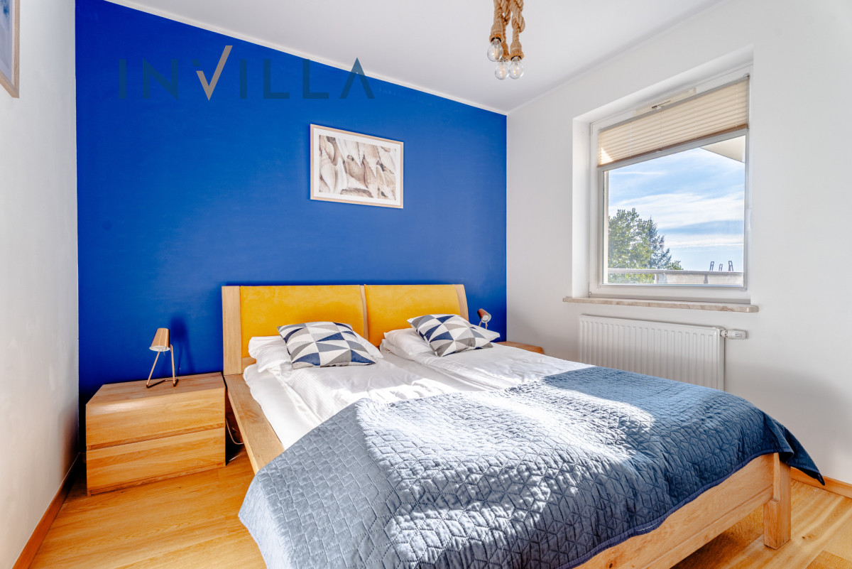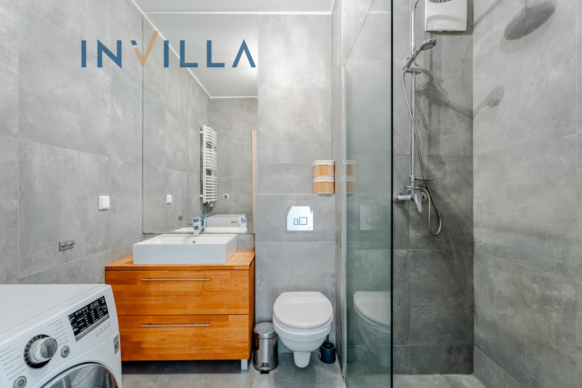 W aneksie znajduje się duża lodówka w zabudowie, zmywarka, kuchenka i piekarnik oraz spory blat roboczy. Łazienka z prysznicem, płytki imitujące beton. W sypialni znajdziemy szafę i duże, wygodne łóżko. Miejsce do przechowywania znajduje się również w przestronnym przedpokoju.