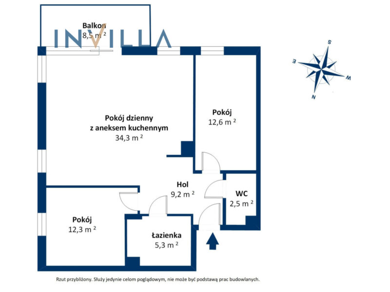 • salon z aneksem kuchennym z wyjściem na balkon,
