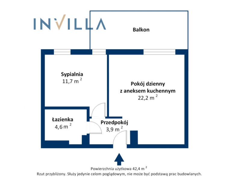 Układ: salon z aneksem kuchennym (22,2 m²), sypialnia (11,7 m²), łazienka (4,6 m²), przedpokój (3,9 m²).