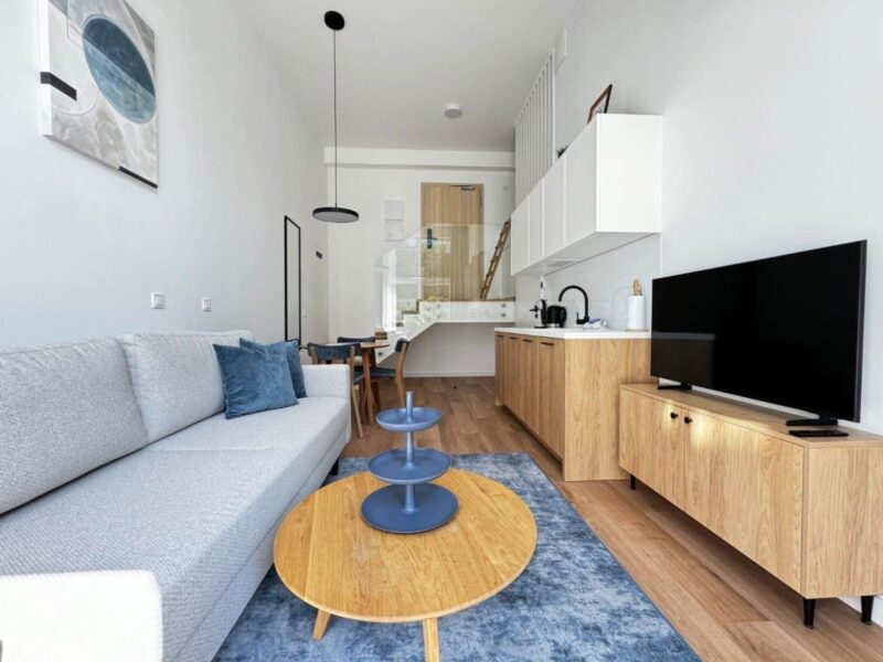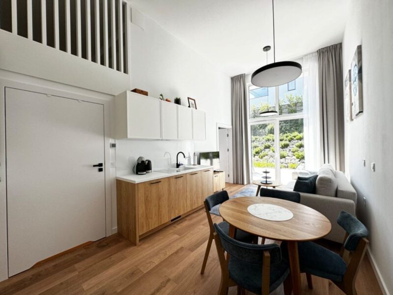 Luksusowy apartament o powierzchni 37,5 metrów kwadratowych, usytuowany na pierwszym piętrze, zaprojektowany i wykończony w wysokim standardzie o eleganckich, jasnych barwach z ciemnymi akcentami, oferując wyjątkowy komfort i estetykę. Inwestycja składa się z przestronnego salonu z aneksem kuchennym i małą antresolą, przytulnej sypialni oraz łazienki. Dużym atutem nieruchomości są panoramiczne okna, które wprowadzają sporą ilość światła w ciągu dnia oraz prywatny taras, na który można wyjść zarówno z salonu, jak i sypialni. Apartament w pełni wyposażony w nowe meble i sprzęty AGD.