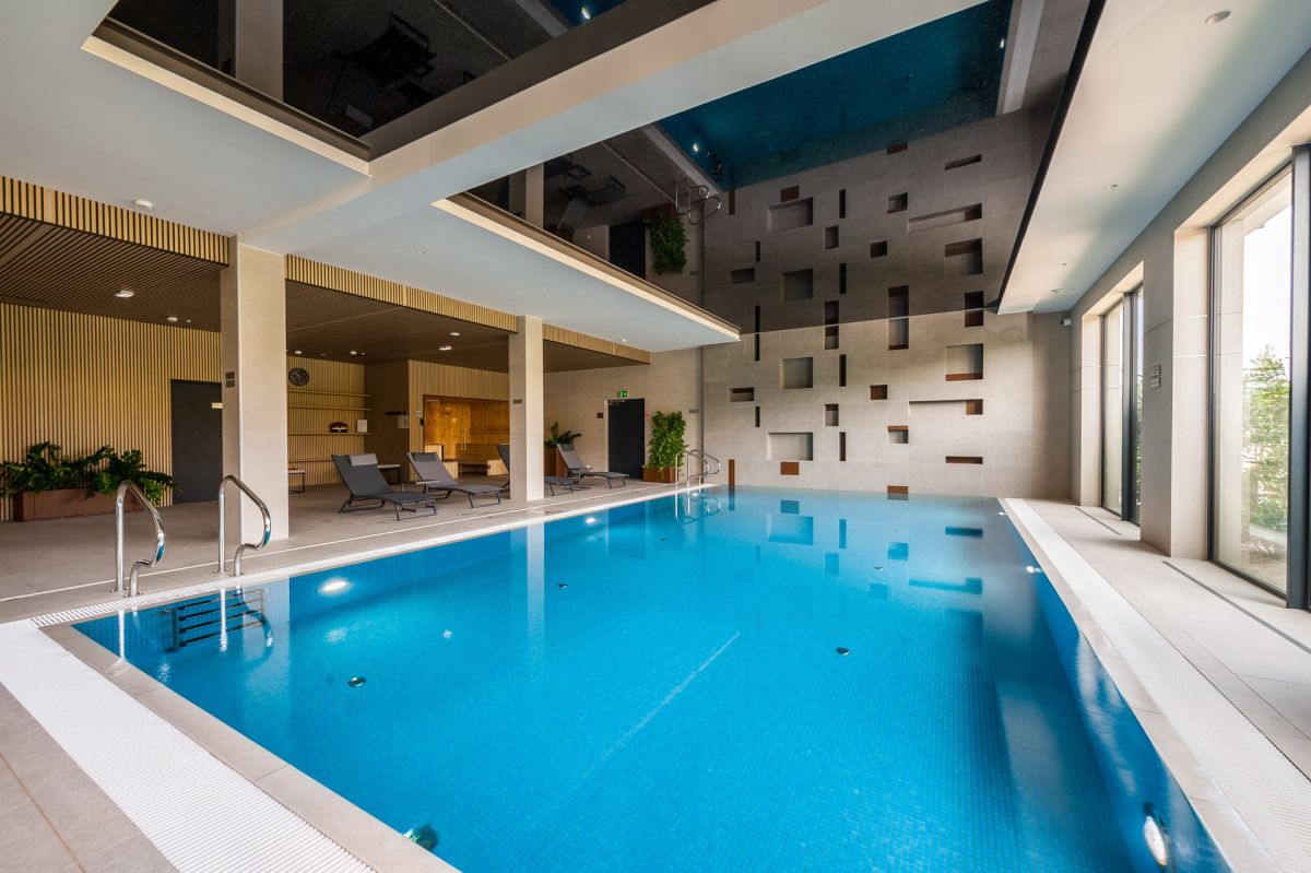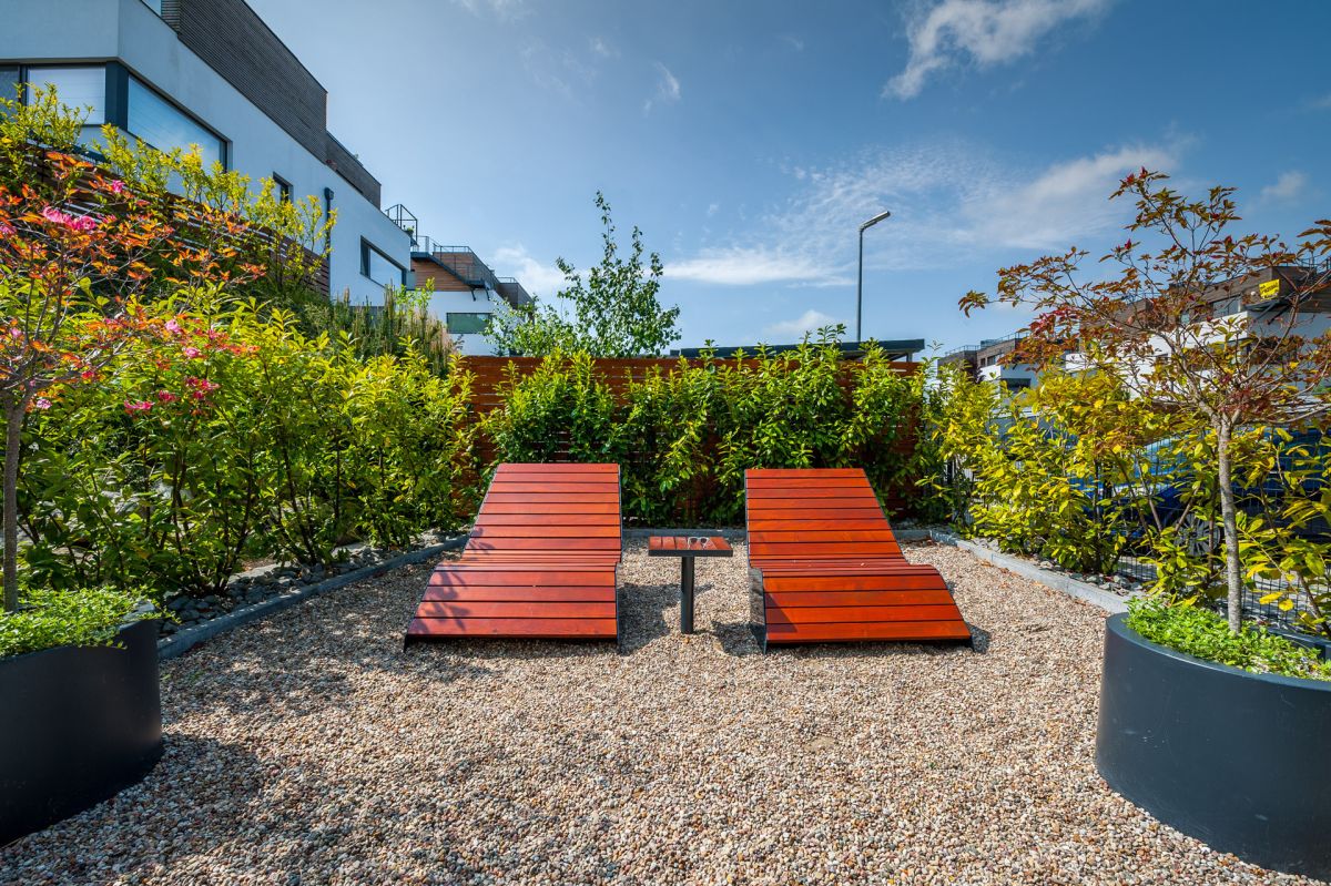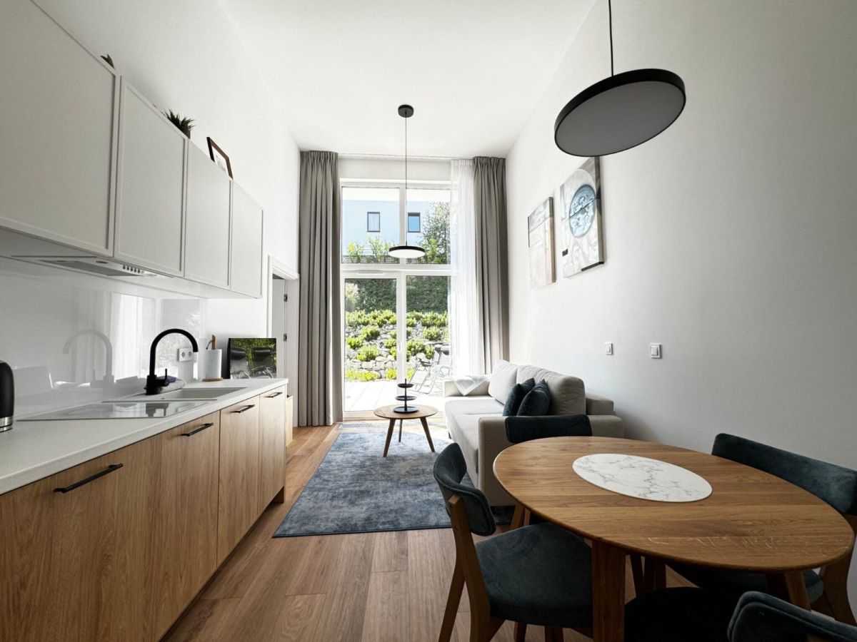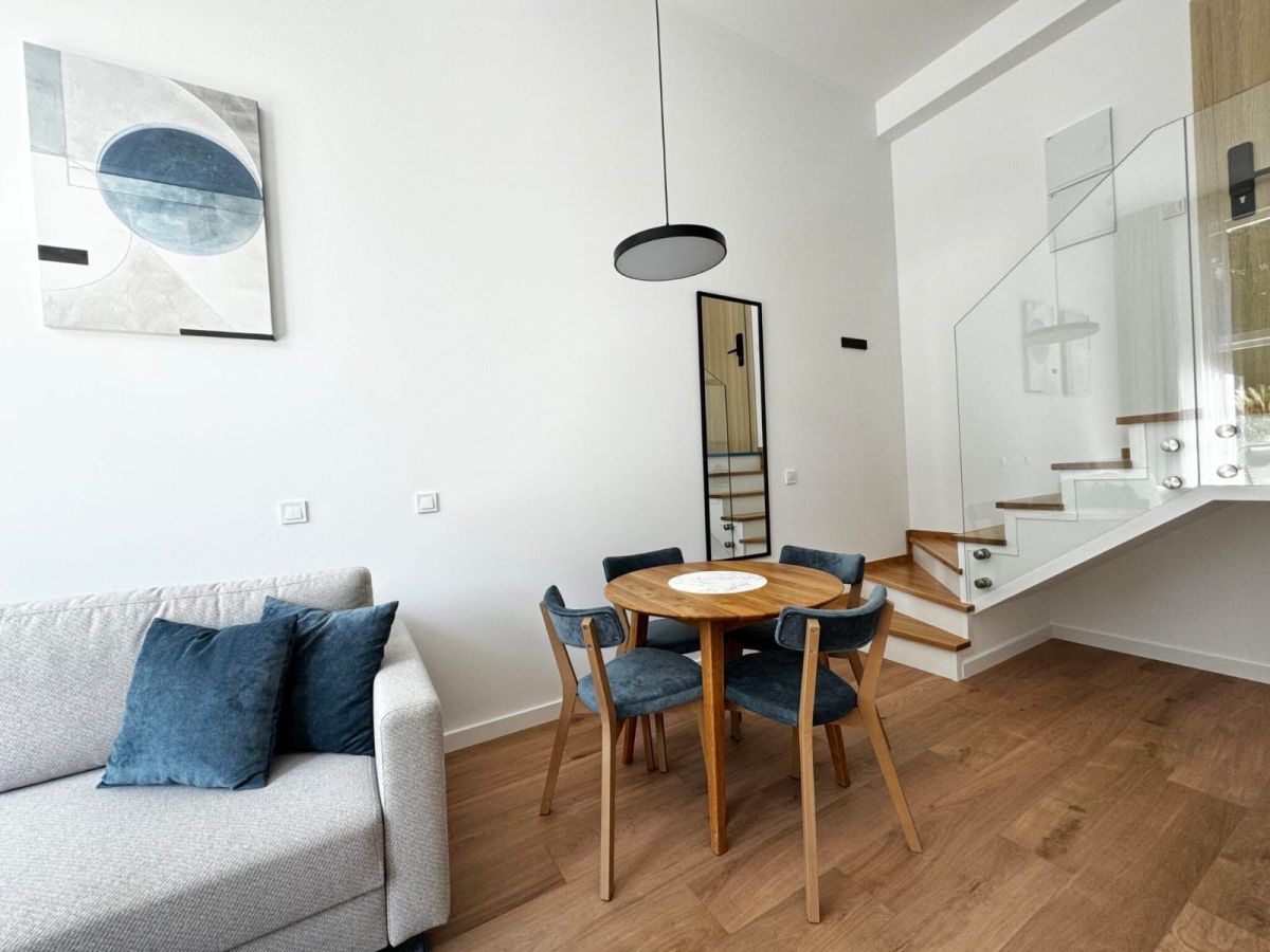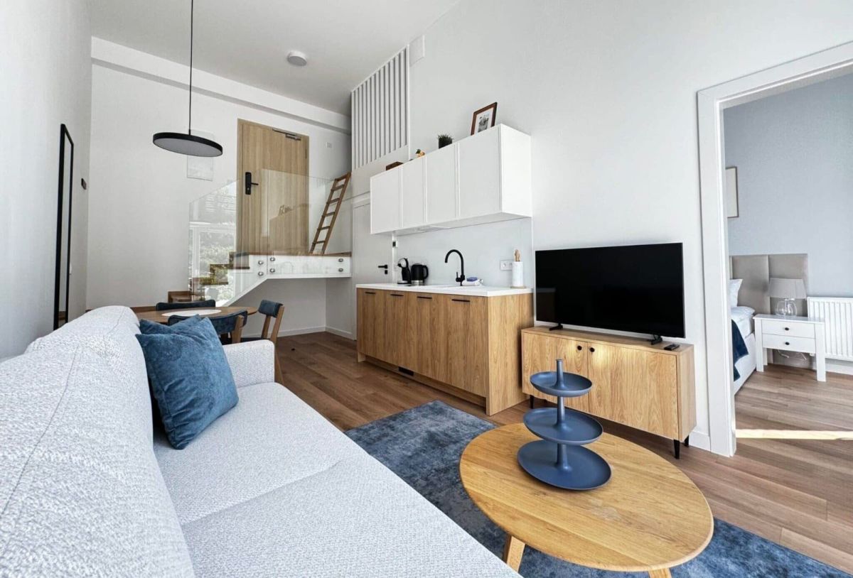 Luksusowy apartament o powierzchni 37,5 metrów kwadratowych, usytuowany na pierwszym piętrze, zaprojektowany i wykończony w wysokim standardzie o eleganckich, jasnych barwach z ciemnymi akcentami, oferując wyjątkowy komfort i estetykę. Inwestycja składa się z przestronnego salonu z aneksem kuchennym i małą antresolą, przytulnej sypialni oraz łazienki. Dużym atutem nieruchomości są panoramiczne okna, które wprowadzają sporą ilość światła w ciągu dnia oraz prywatny taras, na który można wyjść zarówno z salonu, jak i sypialni. Apartament w pełni wyposażony w nowe meble i sprzęty AGD.
