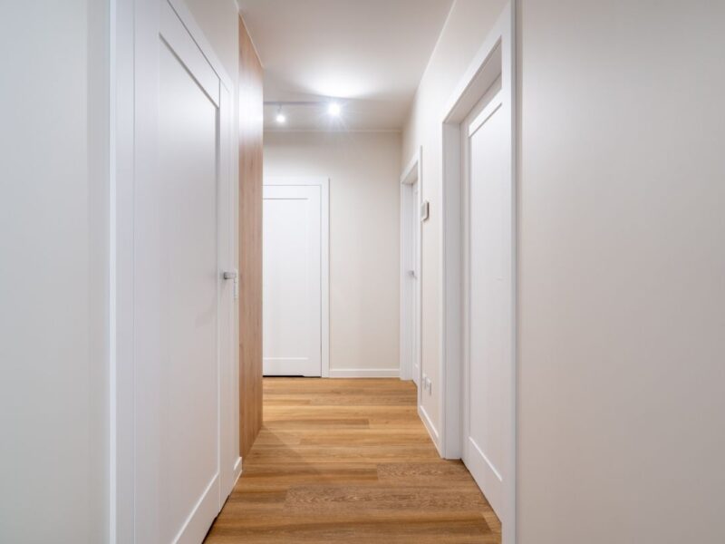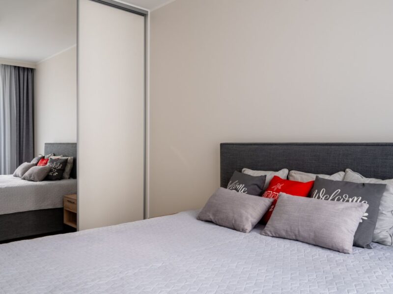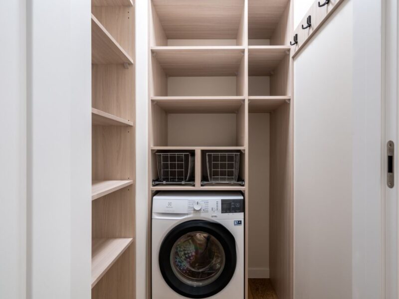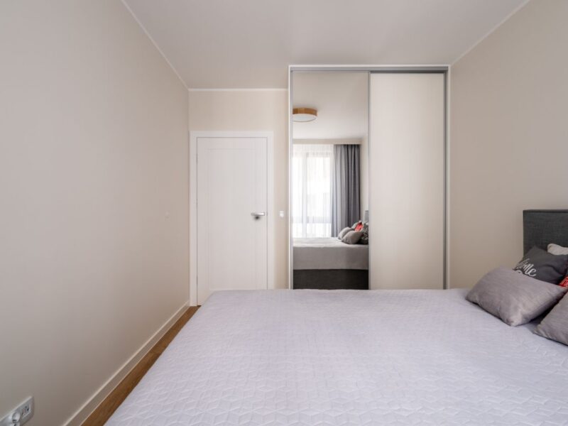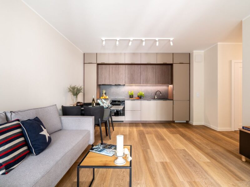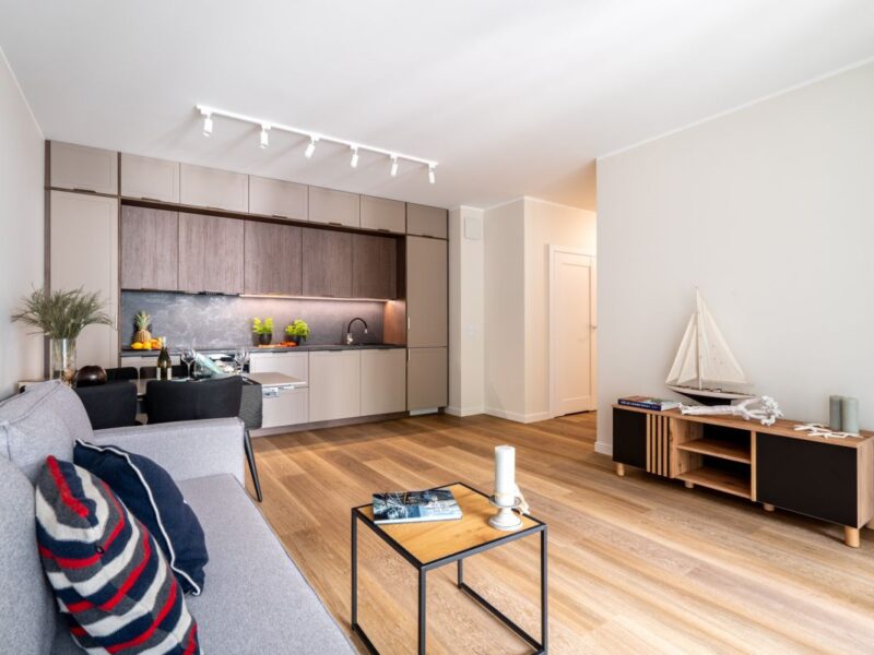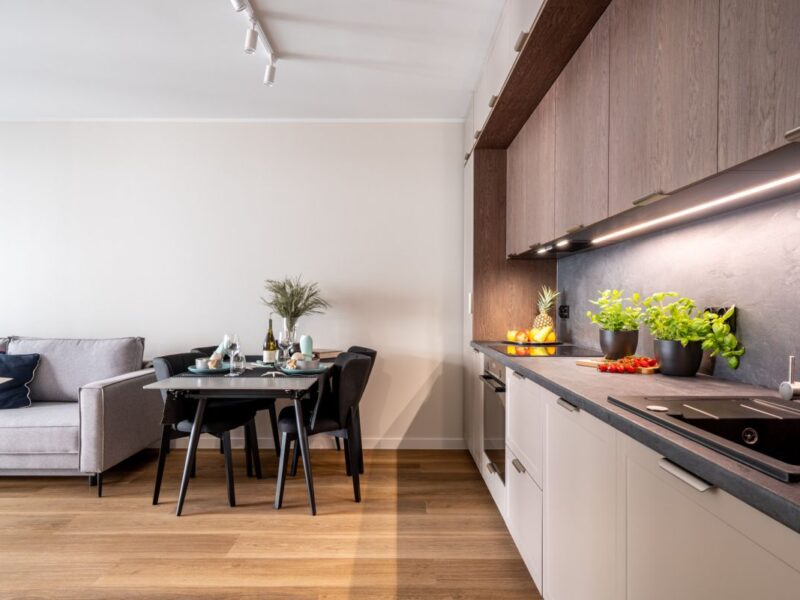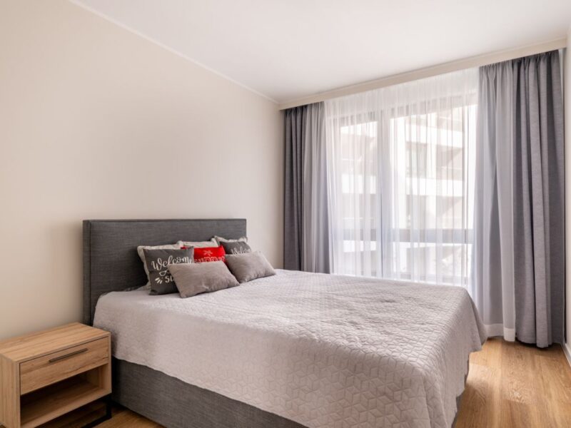 Eleganckie mieszkanie o powierzchni 61,55 metra kwadratowego, z zachodnią ekspozycją, położone na drugim piętrze. Główną część wnętrza stanowi przestronny salon z częścią wypoczynkową i funkcjonalnym aneksem oraz dużym balkonem. Bezpośrednio obok znajduje się dwie sypialnie z zabudowanymi szafami. Łazienkę wyposażono zarówno w wannę jak i prysznic . Dopełnieniem całości jest przestronny korytarz, będący osią komunikacyjną całego mieszkania oraz dodatkowe pomieszczenie gospodarcze z pralką, z możliwością instalacji WC. Wnętrza wykonane pod klucz z dbałością o detale, z wysokiej jakości materiałów, o podwyższonej odporności na zużycie (podłogi winylowe systemowe, zabudowy na wymiar itp.) przy jednoczesnym nacisku kładzionym na wysoką funkcjonalność.