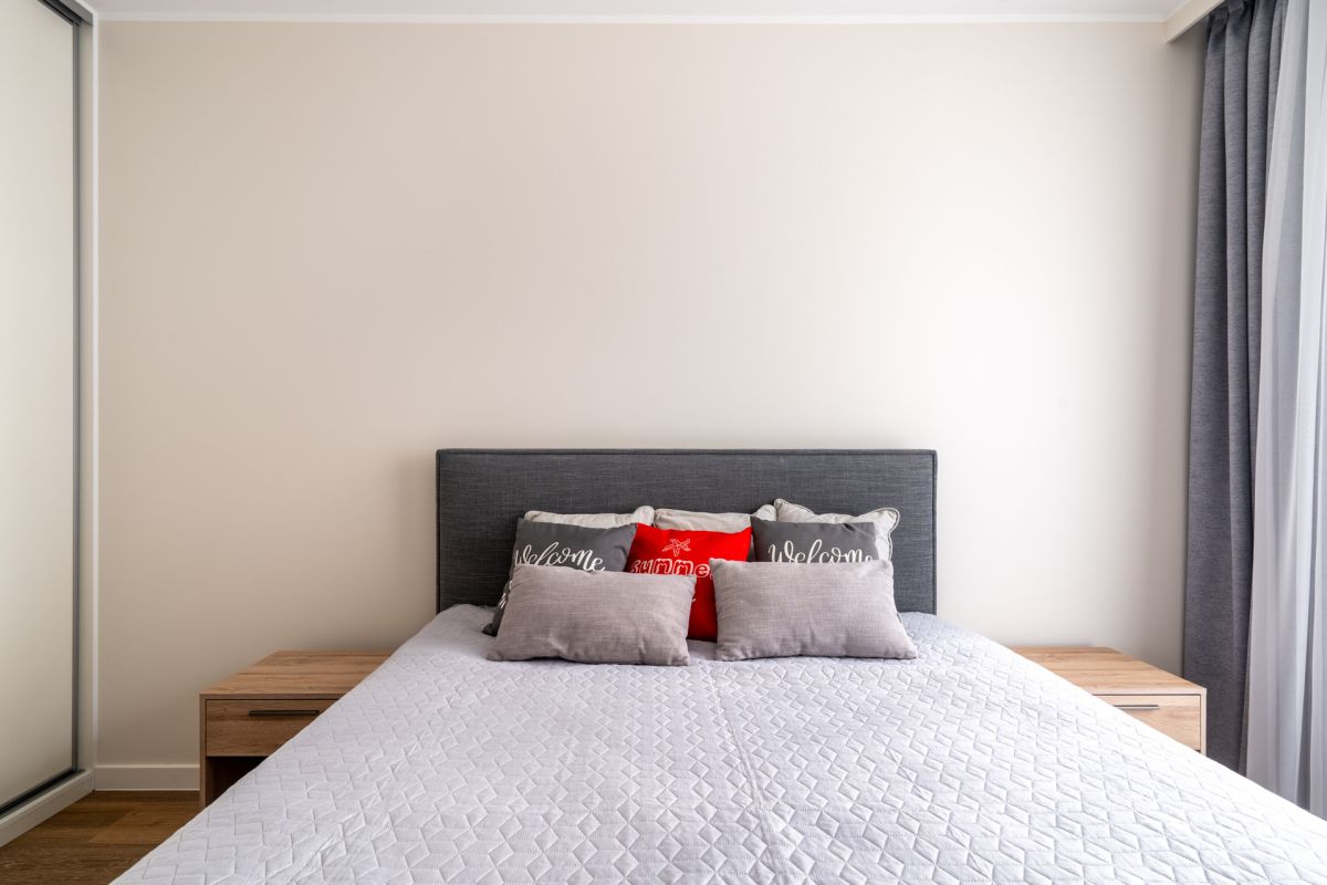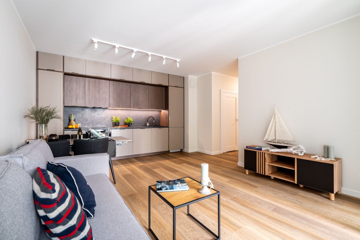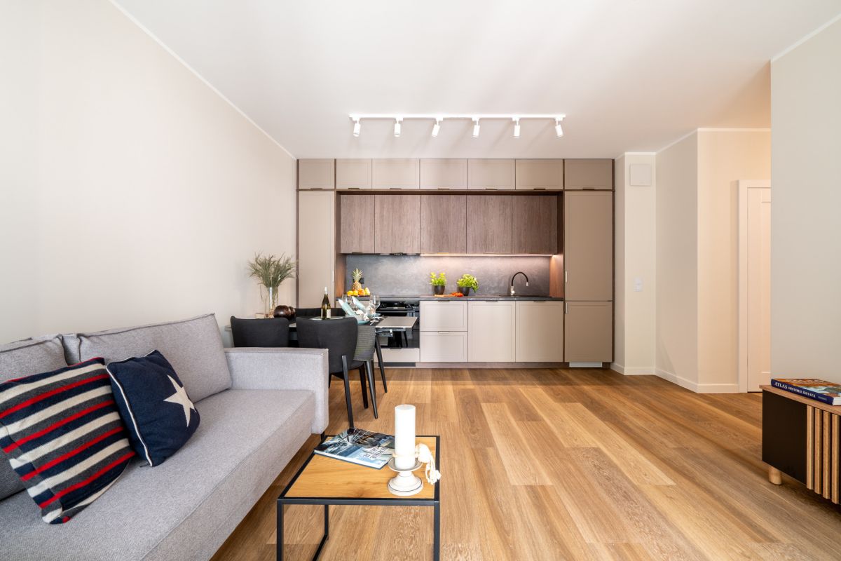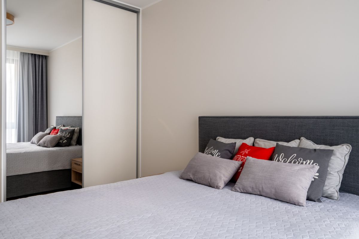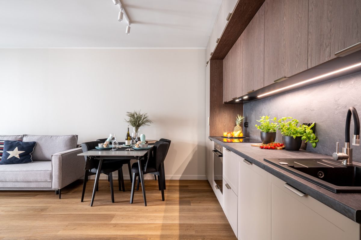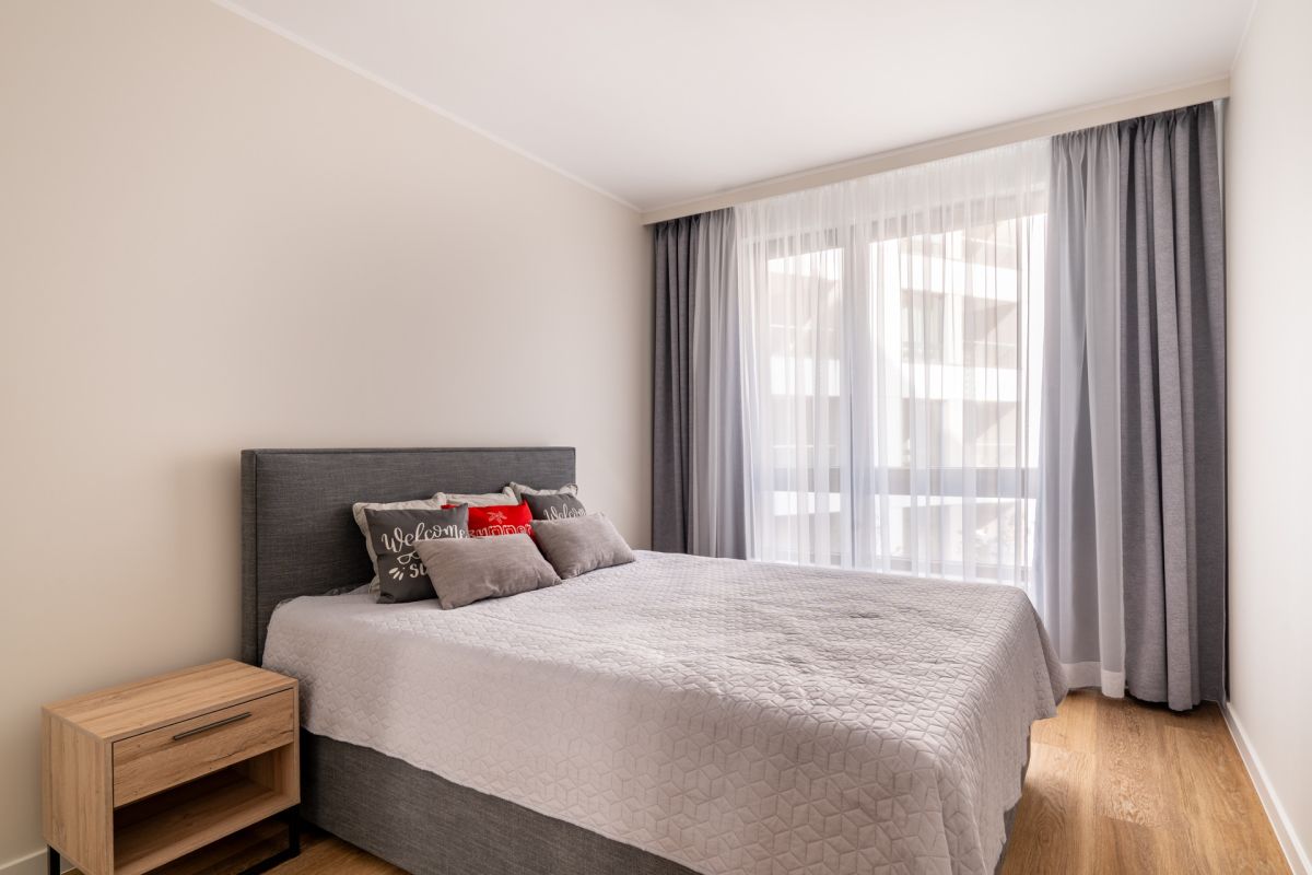 Eleganckie mieszkanie o powierzchni 61,55 metra kwadratowego, z zachodnią ekspozycją, położone na drugim piętrze. Główną część wnętrza stanowi przestronny salon z częścią wypoczynkową i funkcjonalnym aneksem oraz dużym balkonem. Bezpośrednio obok znajduje się dwie sypialnie z zabudowanymi szafami. Łazienkę wyposażono zarówno w wannę jak i prysznic . Dopełnieniem całości jest przestronny korytarz, będący osią komunikacyjną całego mieszkania oraz dodatkowe pomieszczenie gospodarcze z pralką, z możliwością instalacji WC. Wnętrza wykonane pod klucz z dbałością o detale, z wysokiej jakości materiałów, o podwyższonej odporności na zużycie (podłogi winylowe systemowe, zabudowy na wymiar itp.) przy jednoczesnym nacisku kładzionym na wysoką funkcjonalność.