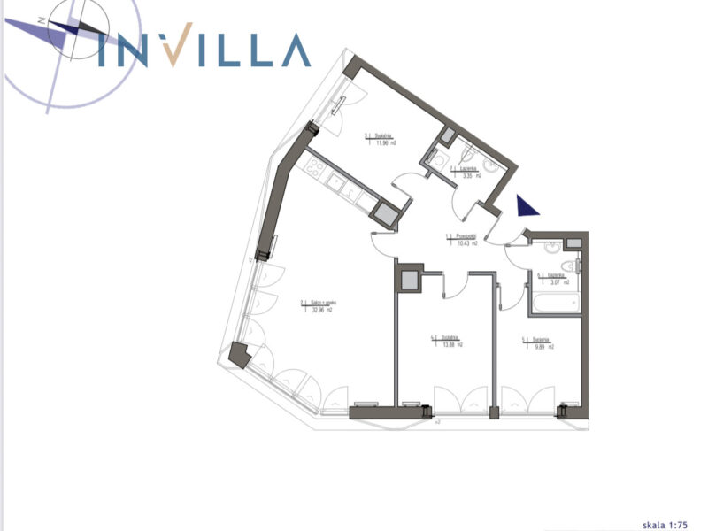 - Przemyślany układ – salon z aneksem kuchennym, trzy sypialnie, łazienka, toaleta i przedpokój z miejscem na zabudowę tworzą wygodne i funkcjonalne wnętrze.