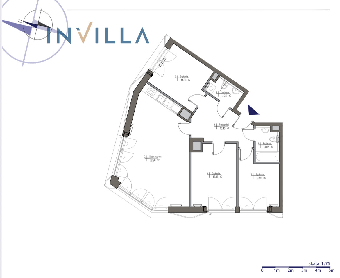 - Przemyślany układ – salon z aneksem kuchennym, trzy sypialnie, łazienka, toaleta i przedpokój z miejscem na zabudowę tworzą wygodne i funkcjonalne wnętrze.