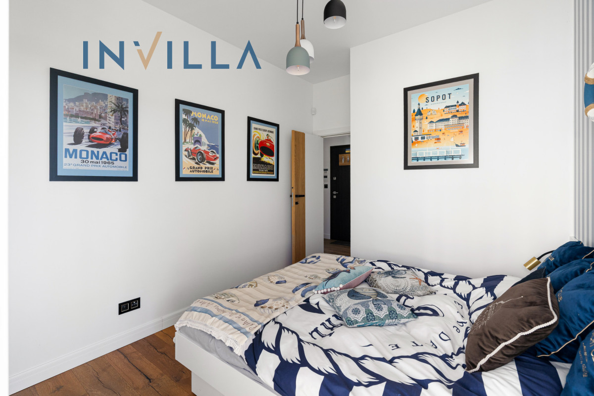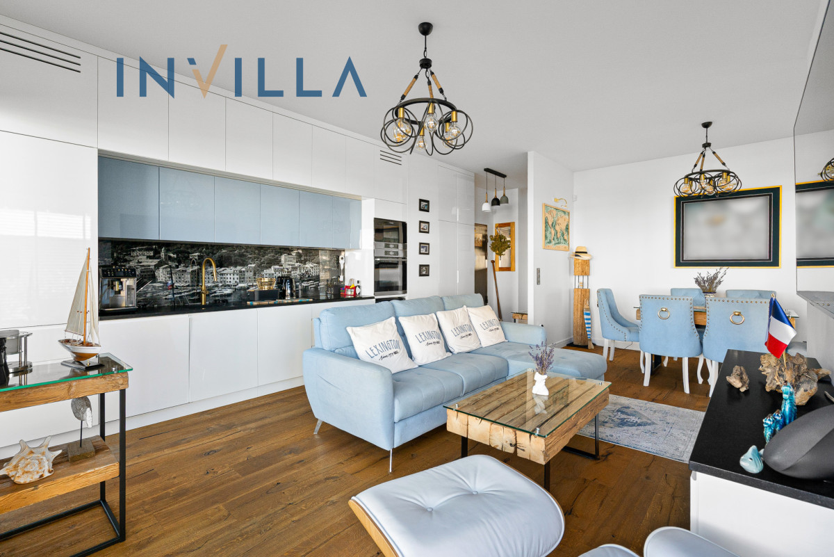 Apartament wykończony został w wysokim standardzie, w jasnych, naturalnych barwach z morskimi akcentami. Naturalna, postarzana deska na podłodze oraz kamienne blaty tworzą spójną, elegancką całość.