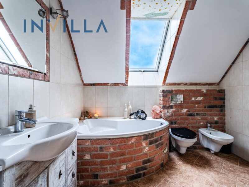 • łazienka w stylu rustykalnym – z narożną wanną i elementami cegły, łącząca elegancję z przytulnością,