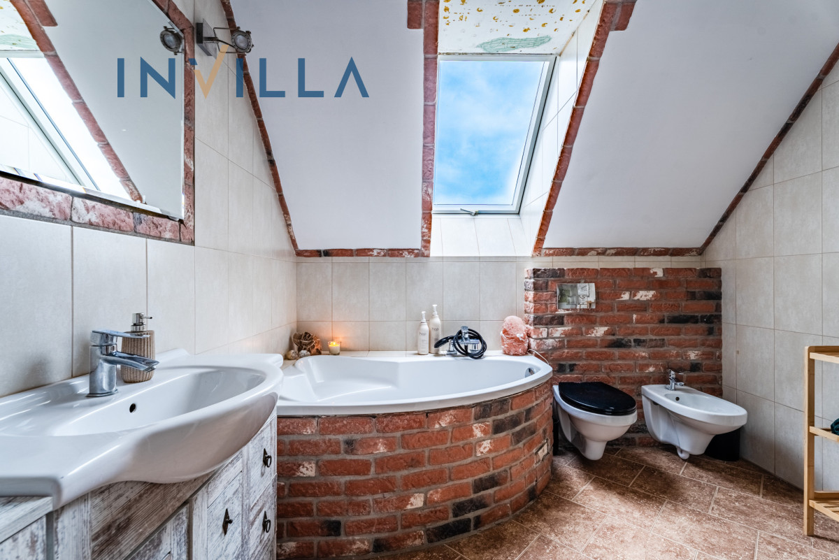 • łazienka w stylu rustykalnym – z narożną wanną i elementami cegły, łącząca elegancję z przytulnością,