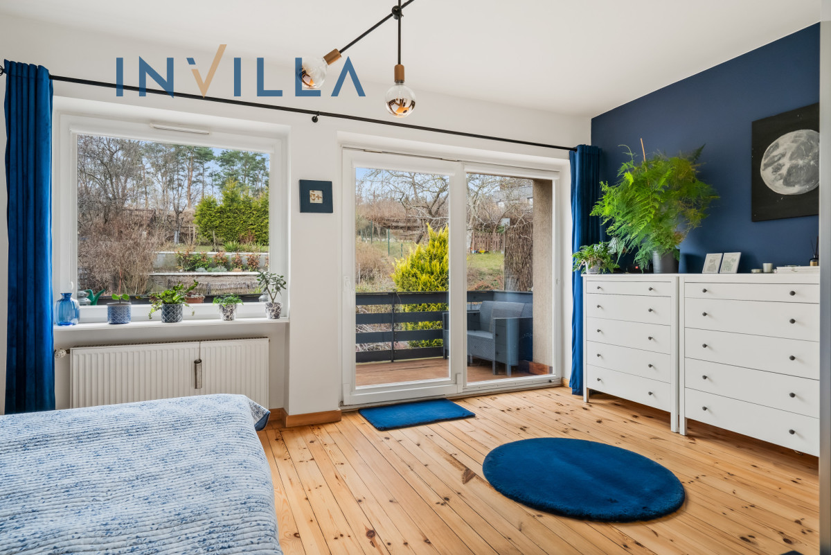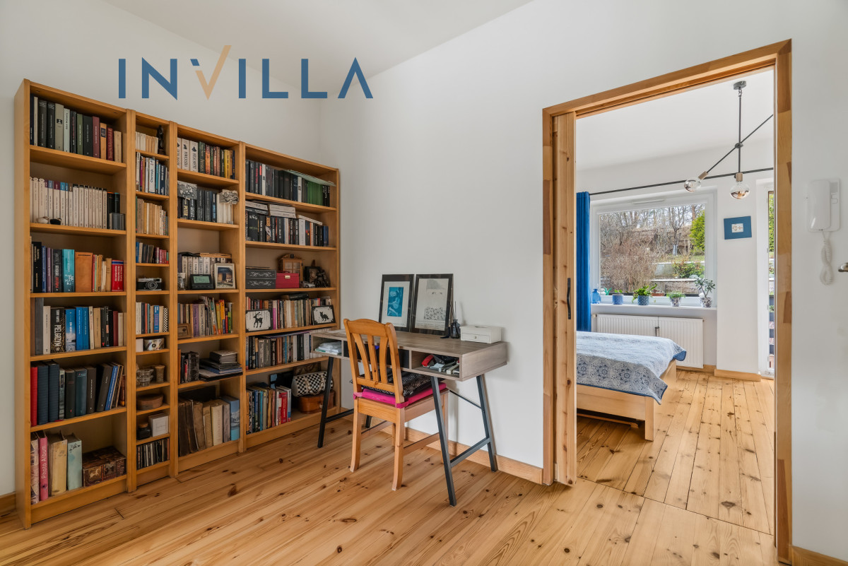 Miejsce wypoczynku z biblioteczką, prowadzącą do drugiej w domu kuchni, która może stanowić również oddzielny pokój oraz przestronnej sypialni z wyjściem na balkon i widokiem na ogród i zieleń.