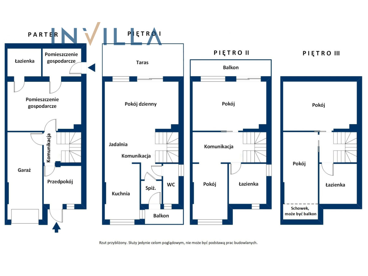- Łazienki na każdym z czterech poziomów budynku,