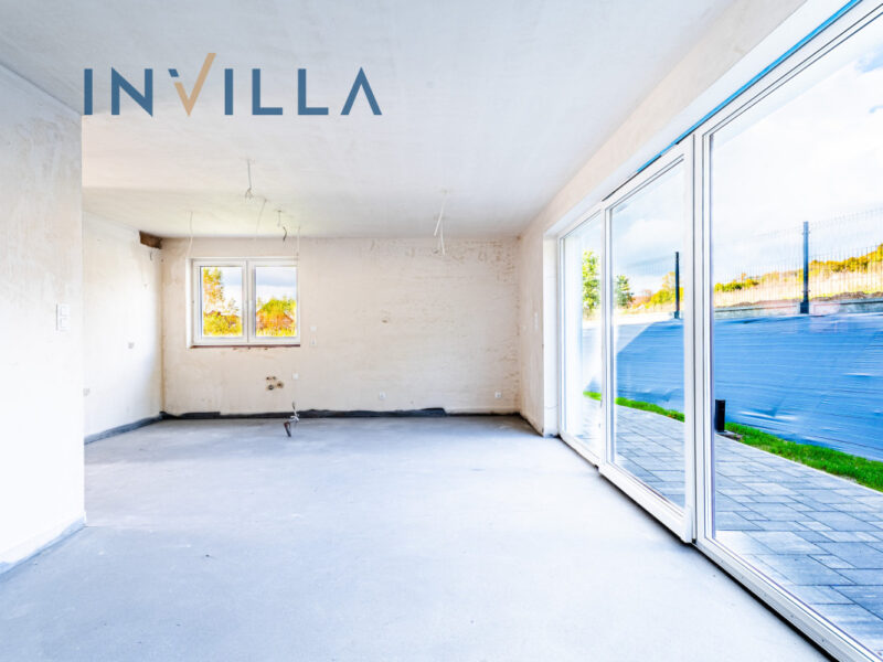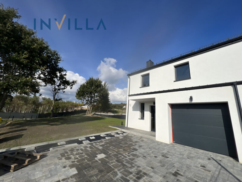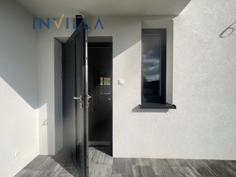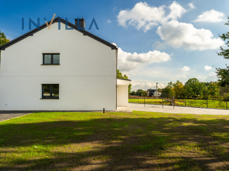 Dom jest ogrodzony i wykończony w wysokim standardzie deweloperskim – okna i drzwi aluminiowe Rehau, brama garażowa Interfkex, blachodachówka, okablowanie pod monitoring, ogrzewanie podłogowe, lampy, zagospodarowany ogród z odwodnieniem.