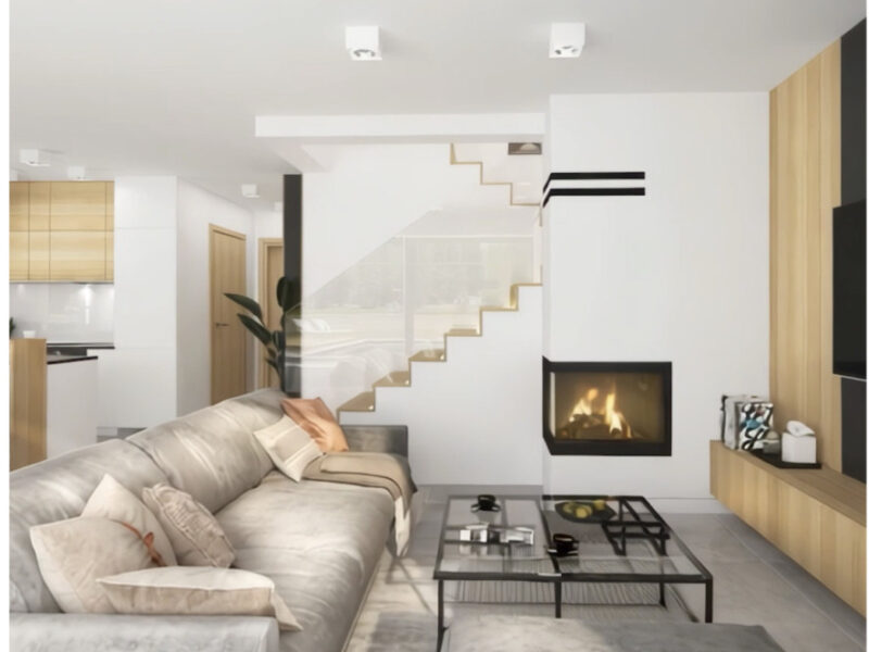 – duży salon z kominkiem i panoramicznymi oknami balkonowymi,