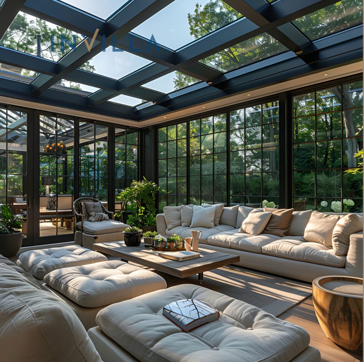 A refined, modern residence centered on a glass-walled winter-garden living room with panoramic views of the old orchard and a stately magnolia. Ideal for residents seeking serenity and close contact with nature without sacrificing comfort or style.