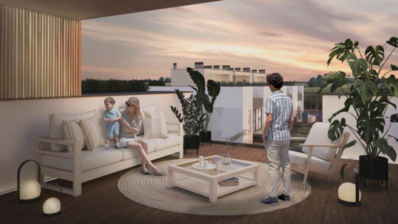 Do każdego z apartamentów przynależy ogródek o powierzchni od 47 m2 do 188 m2 lub taras na dachu o powierzchni apartamentu.