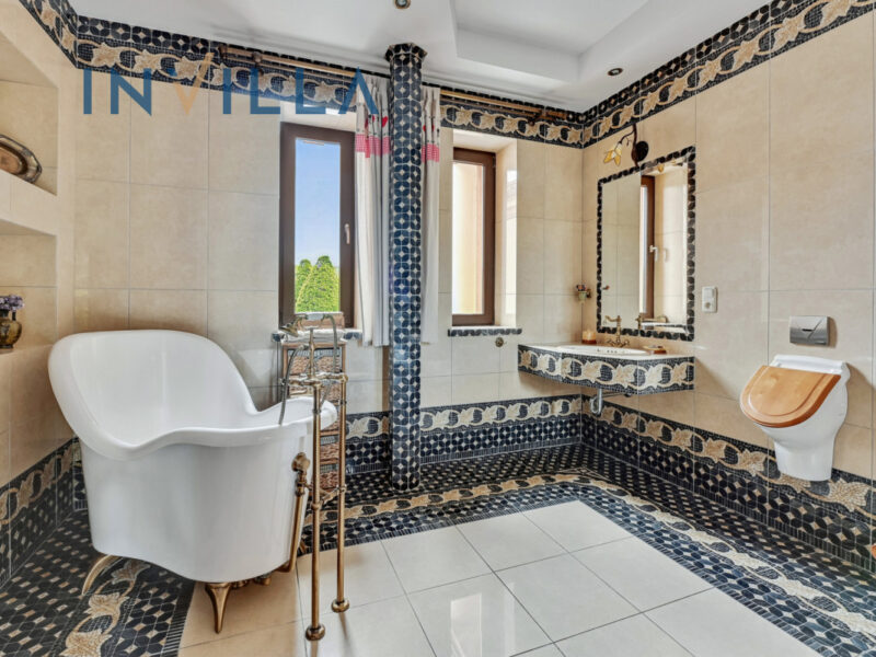 Z jadalni przechodzimy do głównej sypialni z kominkiem 32 m2, garderoby 7,5 m2, łazienki 8,5 m2 oraz gabinetu 13 m2. W budynku głównym mieści się również mieszkanie z oddzielnym wejściem o powierzchni 64 m2. Mieszkanie składa się z salonu z aneksem kuchennym 20 m2, sypialni 32 m2, łazienki 4,5 m2 oraz przedpokoju.
