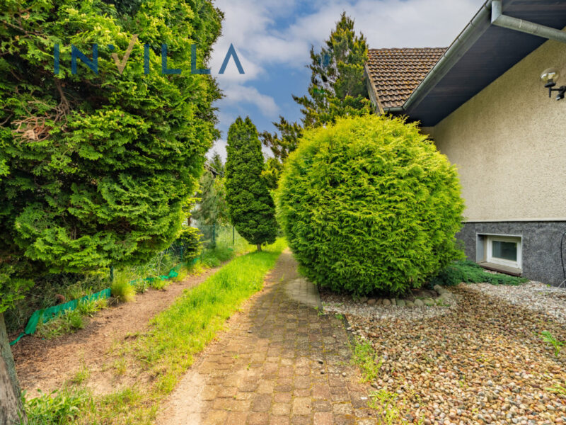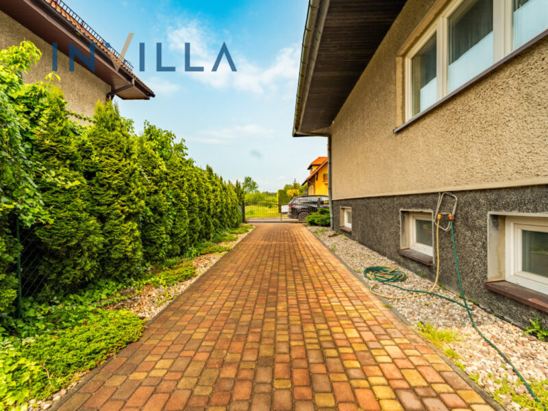 Nieruchomość otoczona jest zielenią, a pełne ogrodzenie wymienione w 2012 roku zapewnia prywatność i bezpieczeństwo. Do dyspozycji mieszkańców są dwa wejścia – od strony furtki oraz od strony bramy wjazdowej. Na posesji znajdują się dwa garaże oraz pomieszczenia gospodarcze – idealne zarówno do prowadzenia działalności, jak i na pralnię, spiżarnię czy schowek. Urokliwy ogród wokół domu zachęca do odpoczynku na świeżym powietrzu.